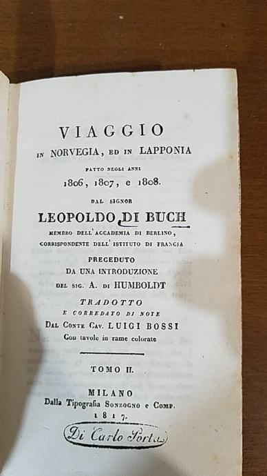 Viaggio in Norvegia, ed in Lapponia fatto negli anni 1806, 1807, e 1808 dal signor Leopoldo di Buch, membro dell'Accademia di Berlino . Preceduto da una introduzione del sig. A. di Humboldt. Tradotto e corredato di note dal conte Luigi Bossi