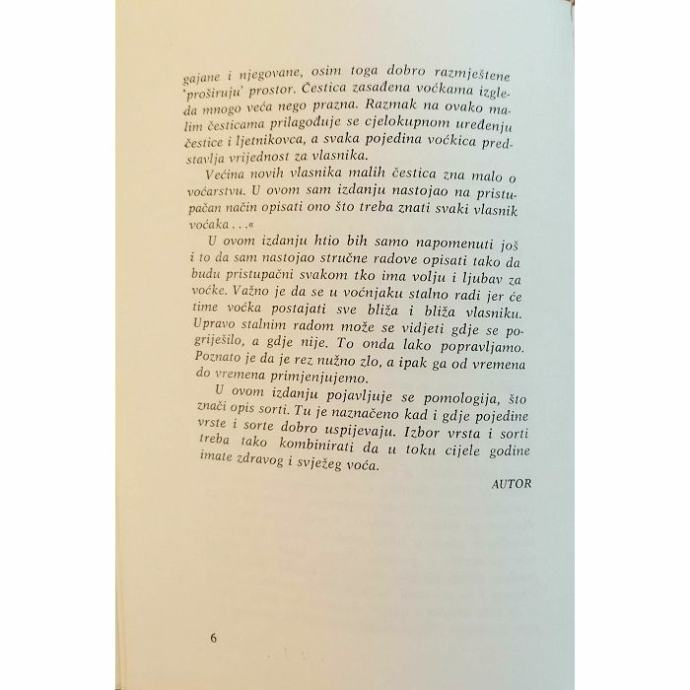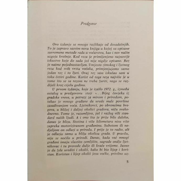 U ovom izdanju htio bih samo napomenuti još i to da sam nastojao stručne radove opisati tako da budu pristupačni svakom tko ima volju i ljubav za voćke. Važno je da se u voćnjaku stalno radi jer će time voćka postajati sve bliža i bliža vlasniku. Upravo stalnim radom može se vidjeti gdje se po-griješilo, a gdje nije. To onda lako popravljamo. Poznato je da je rez nužno zlo, a ipak ga od vremena
