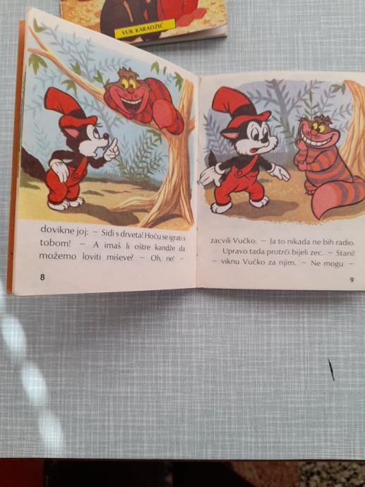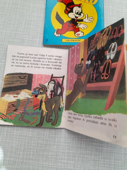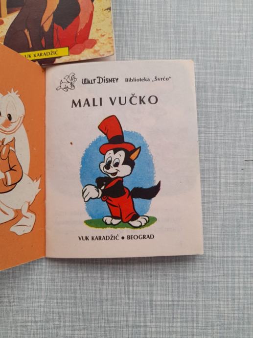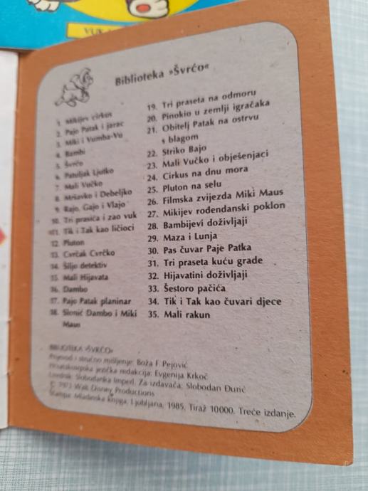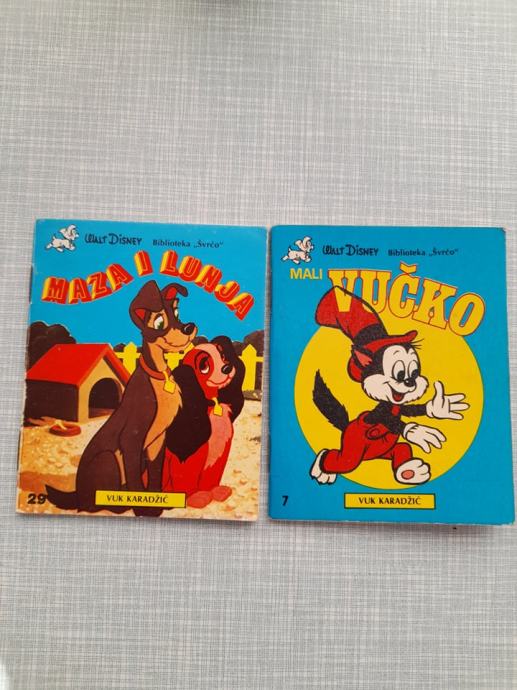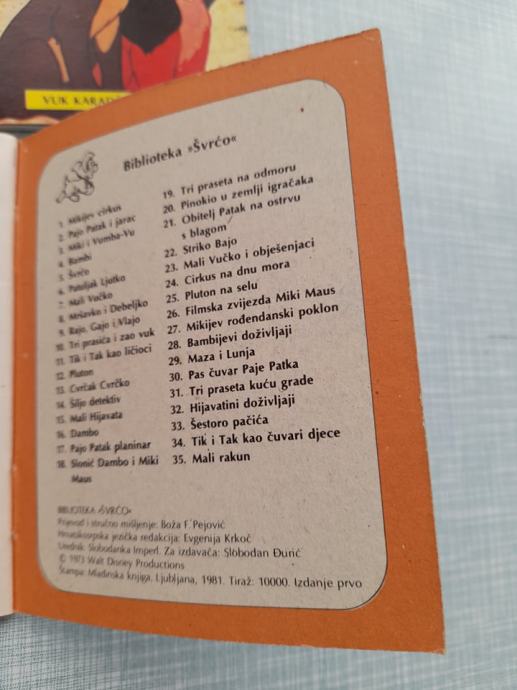 izdaje biblioteka švrćo, 1973 walt disney productions, štampa: mladinska knjiga ljubljana 1981 tiraž 10 000, izdanje prvo za slikovnicu mali vučko, 1985 tiraž 10 000 treće izdanje za slikovnicu maza i luna, dimenzije 9,5x12 cm, vidi slike