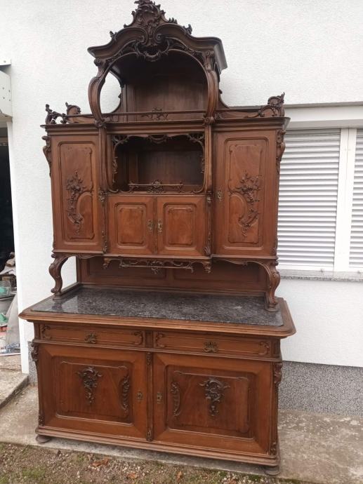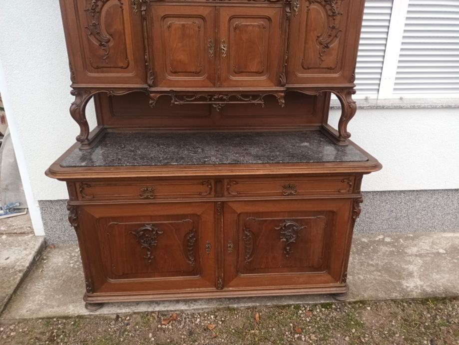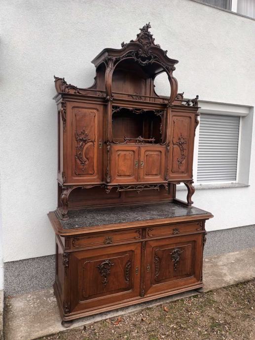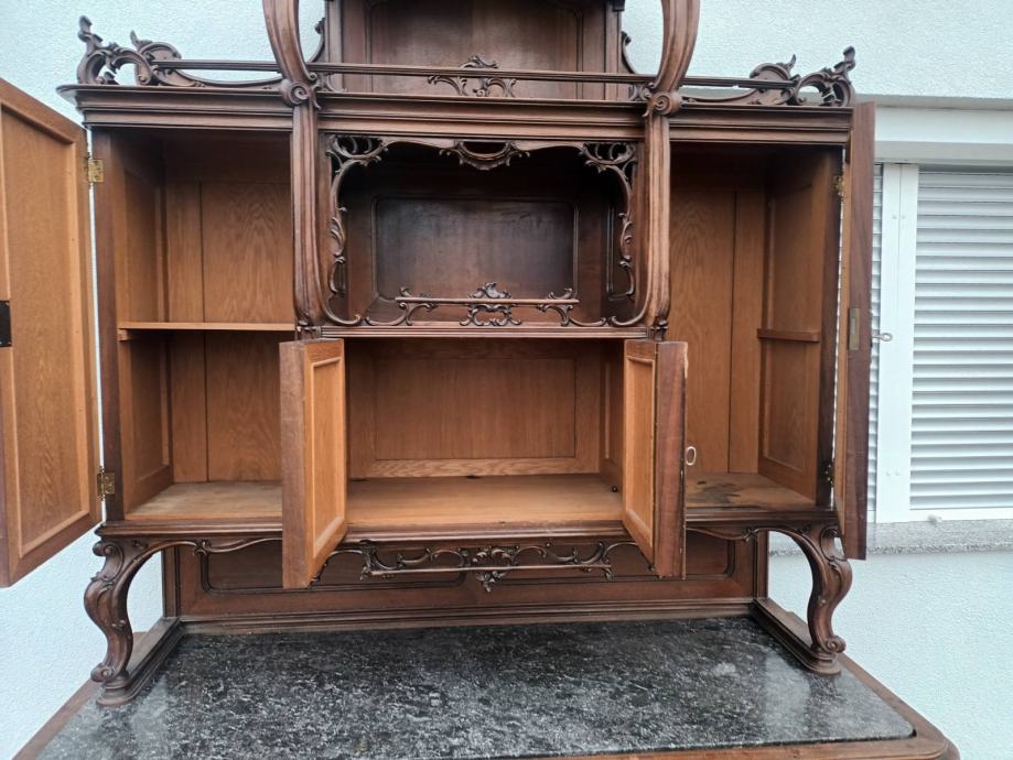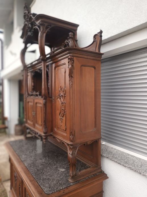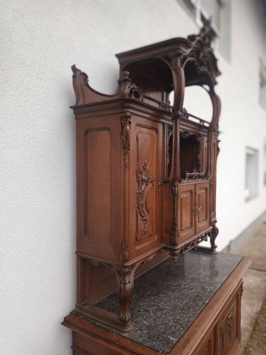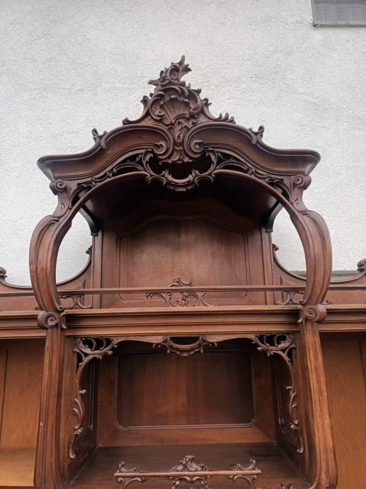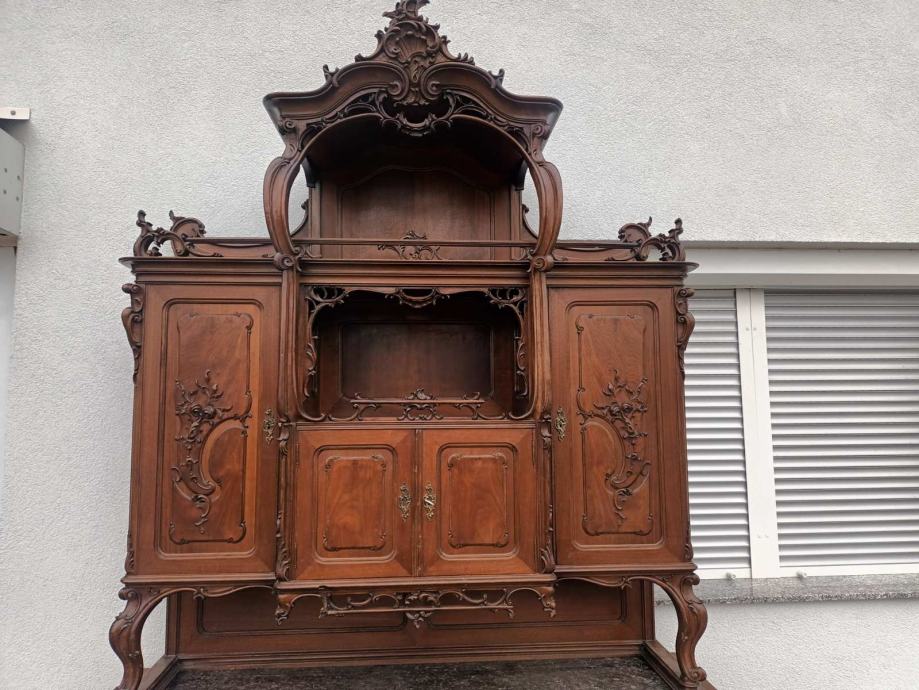 Ovaj masivni rezbareni drveni ormar je antikni komad namještaja, često opisivan kao kredenc, buffet ili vitrina, u stilu Louis XV ili Art Nouveau. Vizualno pretraživanje povezuje ga s namještajem iz kasnog 19. ili početka 20. stoljeća (oko 1900-ih) i stilovima poput bečkog baroka ili rokoko revivala.