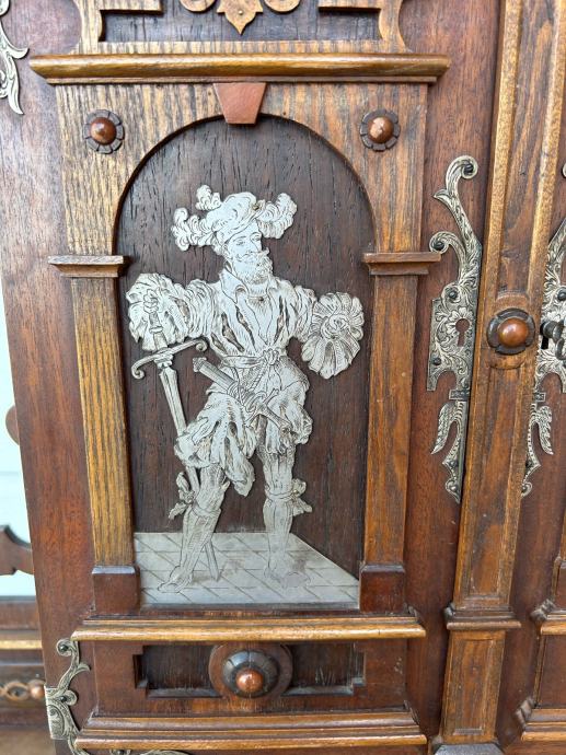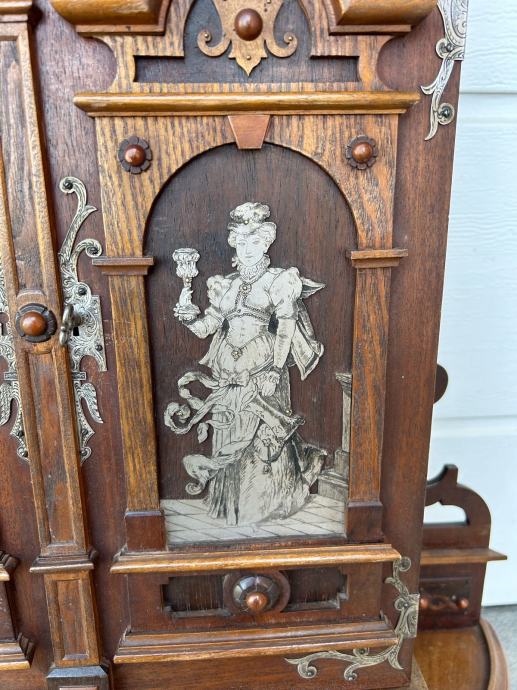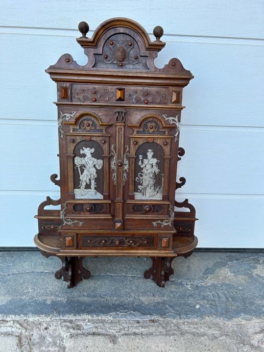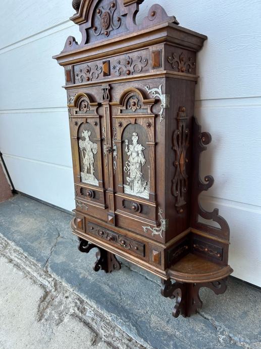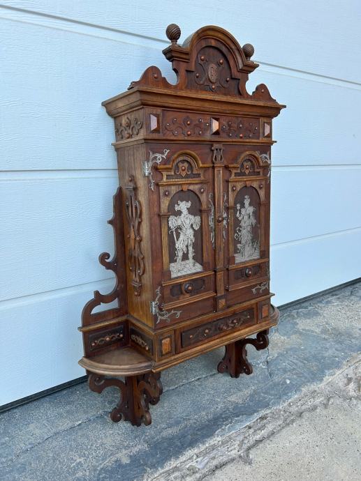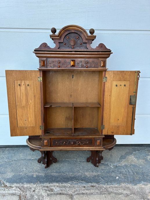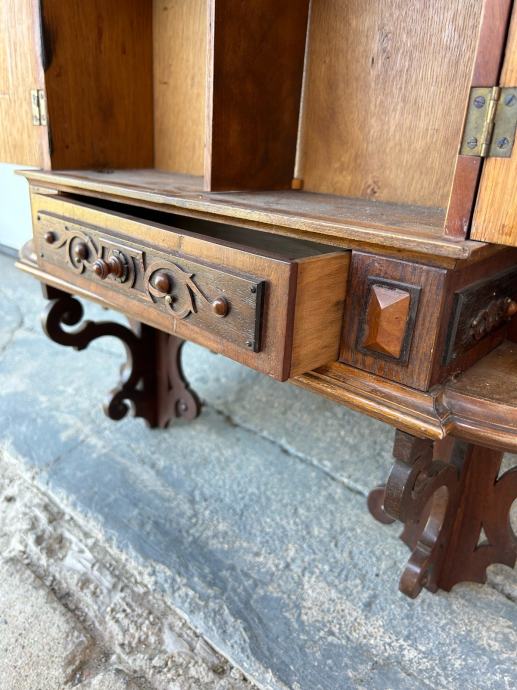 Kucna apoteka(zidni ormaric) napravljen krajem 19stoljeca u vrlo dobrom stanju sa krasnim rezbarijama, tokarijama i jkrasima od cina.