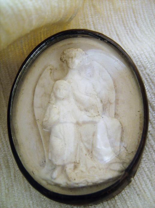 Anđel Gabriel ikona u ovalnom okviru iz 19. stoljeća (meerschaum handcarved reliquary) ili rucno rezbarena žbuka ili ručno rezbarna morska pjena te je zaštićeno konveksnim staklom