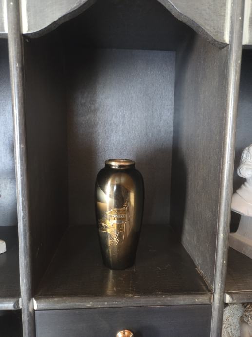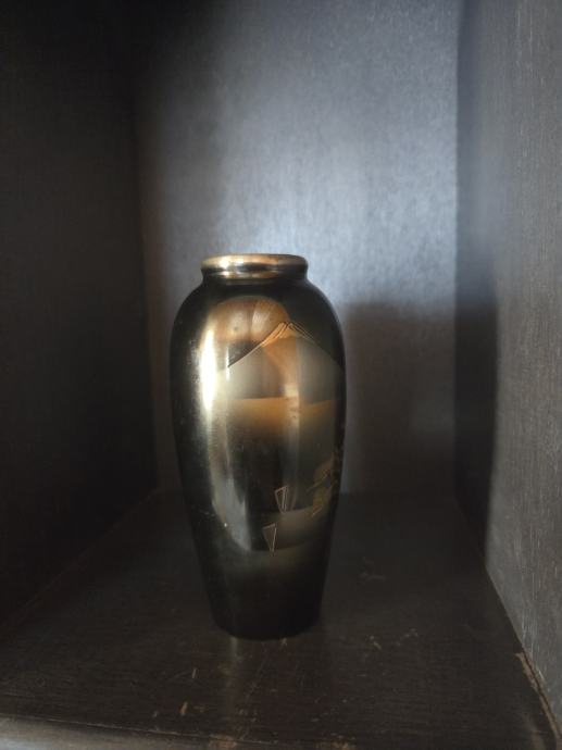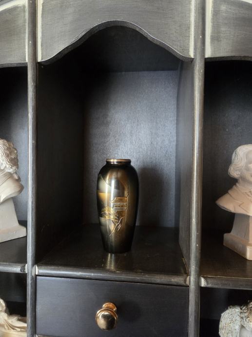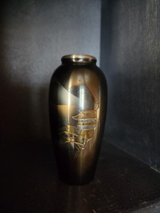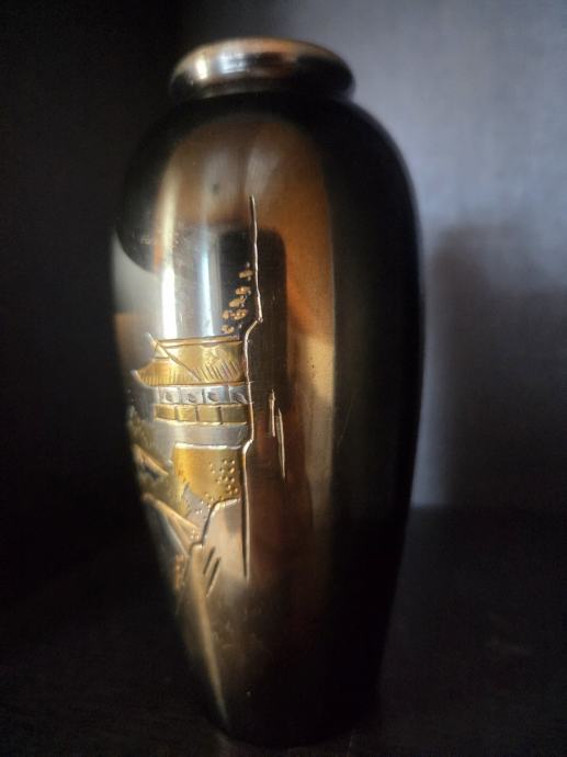 Drvena Japanska umjetnost graviranje bakra ili drugog metala. Tehnika graviranje na bakeu sa pozlatavstilu. Prikazuj drevnu japansku planinu Fuji u prvom planu sa tradicionalnom japanskom kućom.