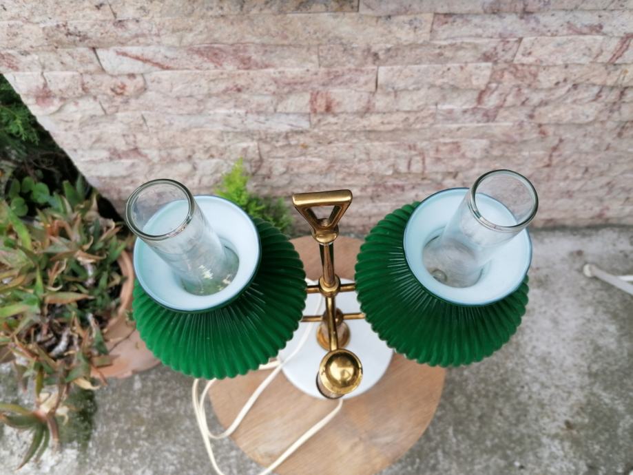 Dakle, ovo ne vidite svaki dan. Predivna velika tzv. direktorska, dvostruka stolna svjetiljka u top stanju. Predivna zelena sjenila. Uporabna. Dimenzije 45x30 cm. Kolekcionarski primjerak. Preporučam osobno preuzimanje u BJ ili ZG. Šaljem poštom na rizik kupca. Dobijete predmet sa slika.