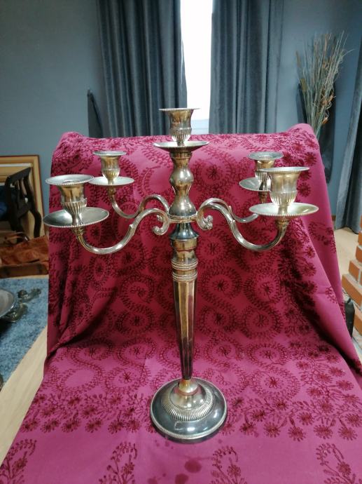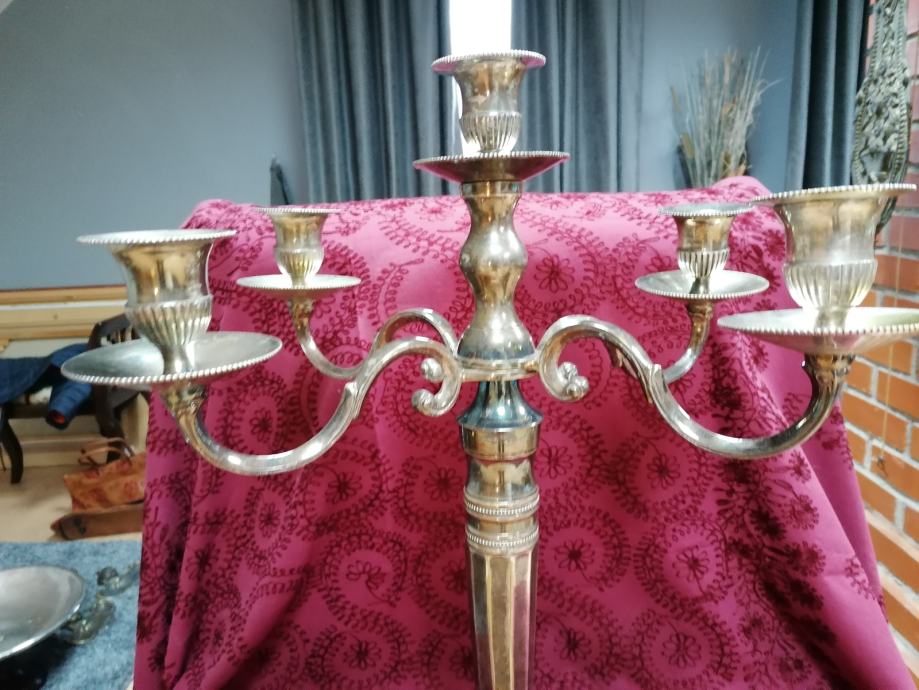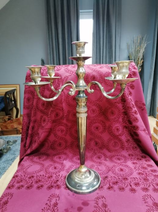 Veliki antik svjećnjak. Posrebreni mesing. Jako težak. Dimenzije 62x40 cm. Inače u odličnom stanju. Dekorativan i uporaban. Dobijete predmet sa slika.