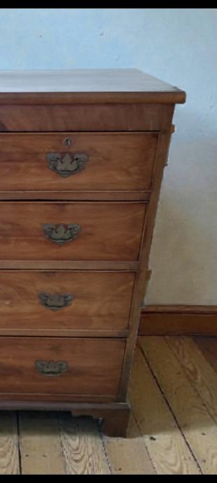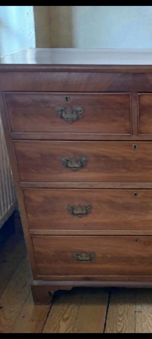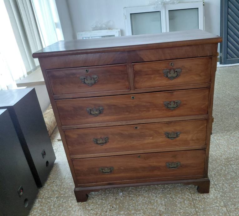 Prodajem antiknu englesku komodu izrađena od kvalitetnog masivnog drveta. Komoda ima pet ladica (dvije manje gore i tri veće ispod), s originalnim metalnim ručkicama i bravicama, tipičnima za engleski stil kraja 19. / početka 20. stoljeća.