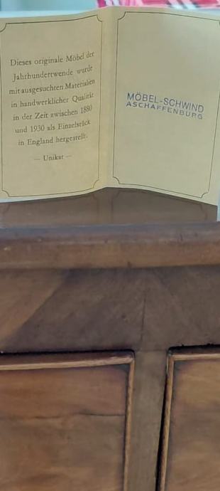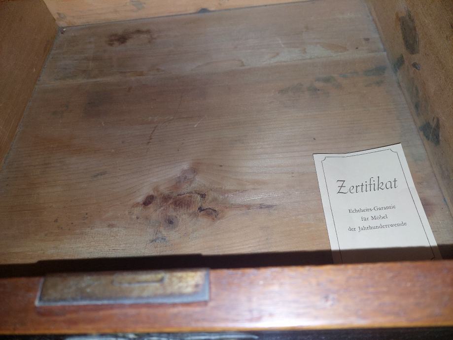 Uz komodu dolazi certifikat renomirane njemačke kuće Möbel-Schwind (Aschaffenburg) koji potvrđuje da se radi o unikatnom, ručno izrađenom engleskom antiknom komadu iz razdoblja 1850.–1930.