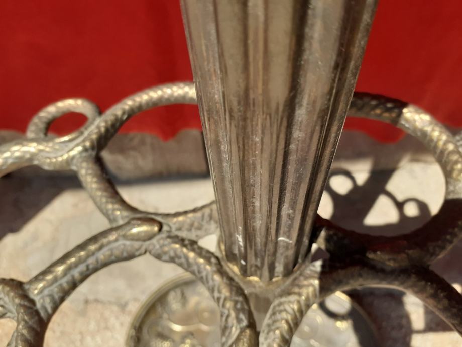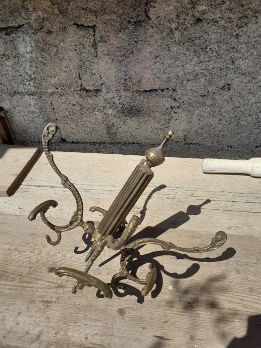 Prodaje se antikna mesingana vješalica visine cca 173 cm, dužine baze 34 cm i širine baze 25 cm, dok je dužina držača štapova i kišobrana 35 cm, a širina 25 cm. Vrh vješalice se može odvojiti i vrtiti oko svoje osi te nije fiksan. Baza je dekorirana uzorkom lišća vinove loze i grožđa i ima 4 mala i plitka površinska napuknuća sa donje strane. Držač za štapove i kišobrane je oblikovan spletom 4 zmije. Na tijelu jedne zmije vidljiva na fotografiji uska pukotina koja ne utječe na čvrstinu i kompaktnost držača; moguće nastalo pri izradi elementa držača. Sa donje strane držača vidljiva 4 mala površinska napuknuća (vidljivo na fotografijama). Cijena mesingane vješalice je 531 eura. Mogućnost osobnog preuzimanja u Zadru.