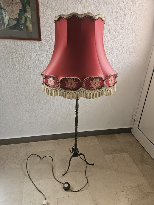 podna lampa od mesinga, Empire stila koju krasi prekrasno sijenilo od satena bordo boje, sa izvezenim rubom i resicama. U funkciji je