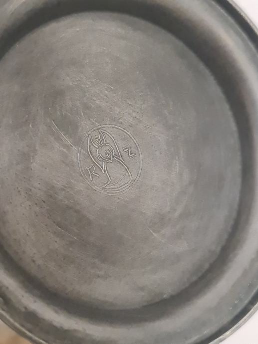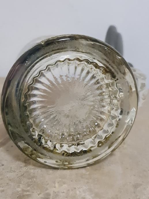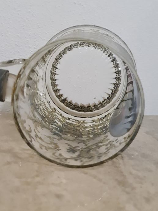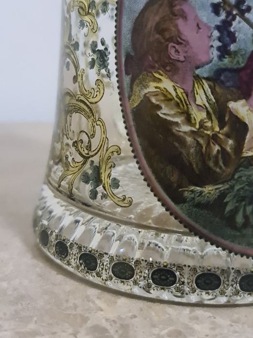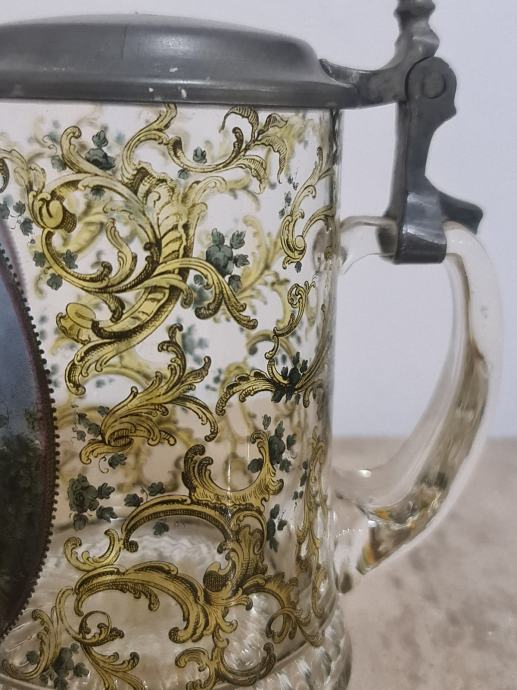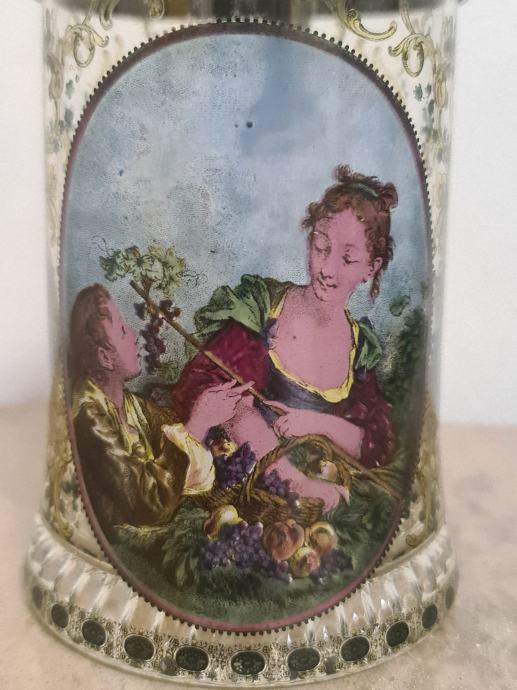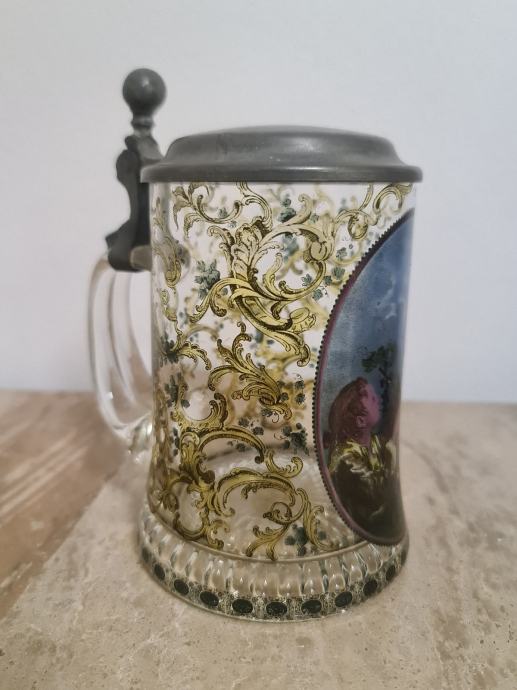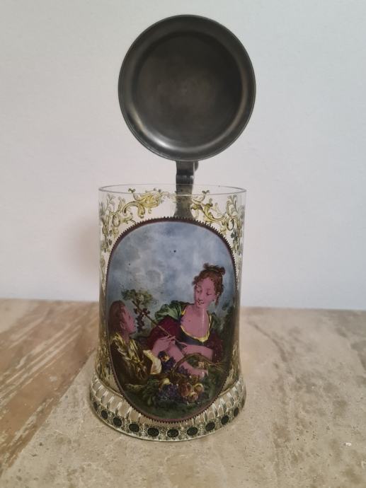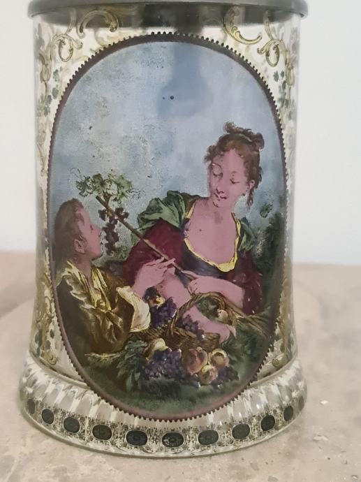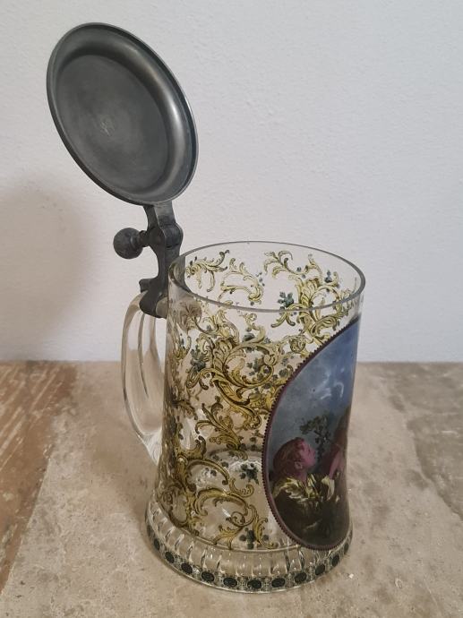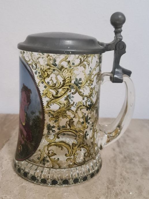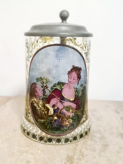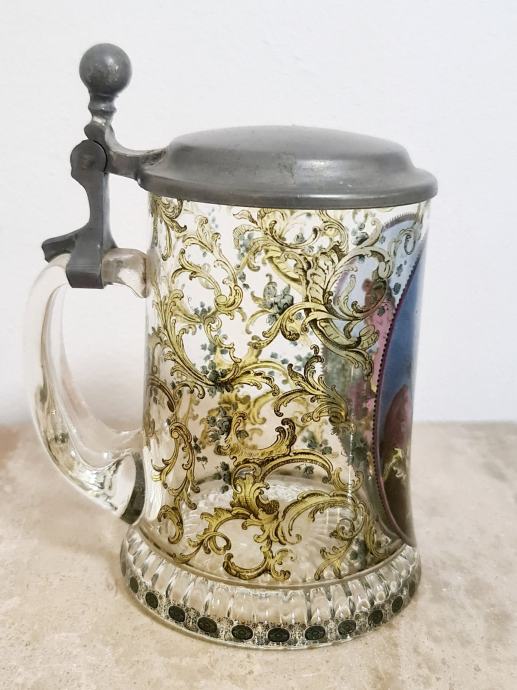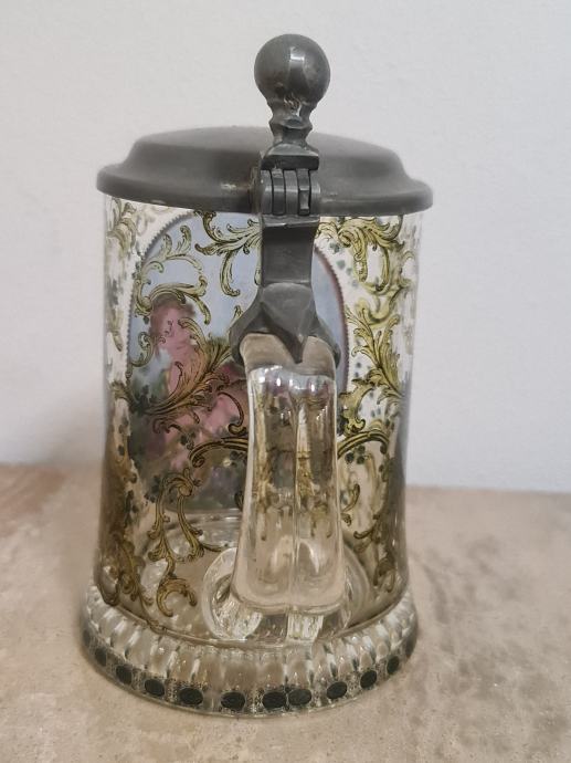 Staklena krigla sa poklopcem od cina. Lijepo oslikana. Očuvana, stanje vidljivo na fotkama. Dimenzije 16 cm x 12 cm.