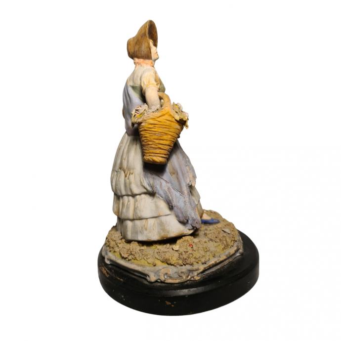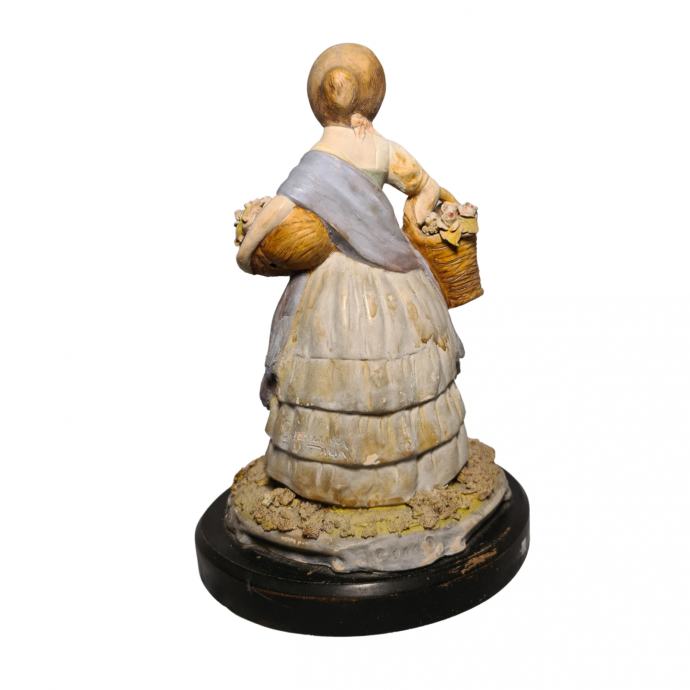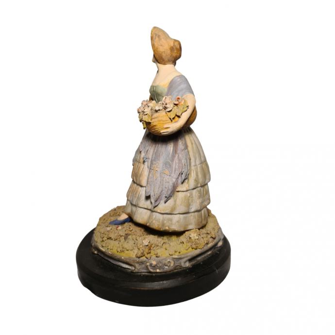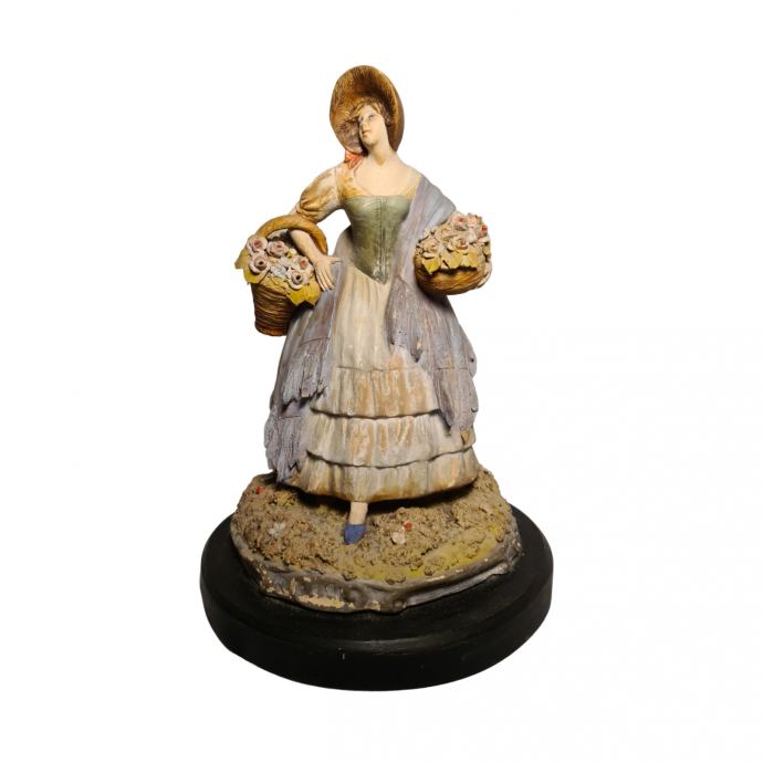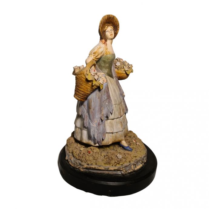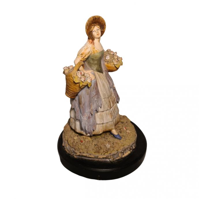 Keramička figura prodavačice cvijeća u odličnom stanju. Figura je postavljena na drveno postolje, izrađena je u prvoj polovici 20.st. u Italiji.
