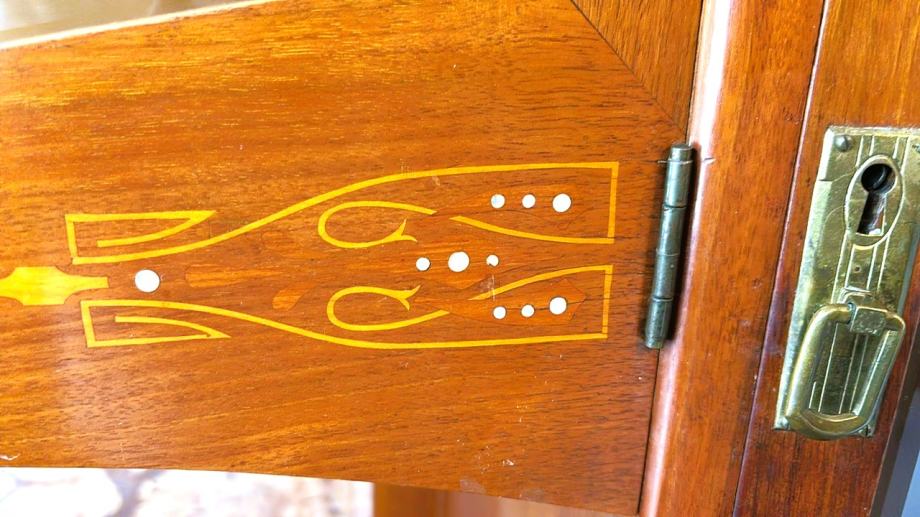 Dvije velike i duboke ladice, dvije manje bočne ladice. Donji dio se otvara i ima police, kao dva središnja i dva bočna ormarića ostakljena i originalno intarzirana.