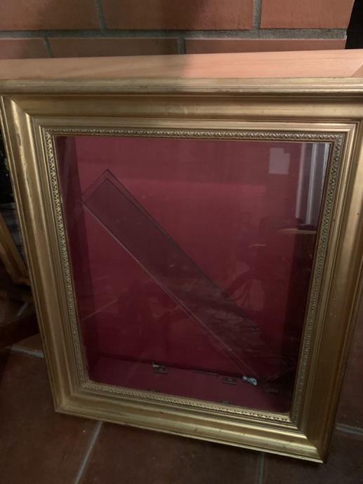 Antikna zidna ustakljena polica, može biti ugradbena, pozlaćeni drveni okvir sa 1 staklenom policom iznutra, nosači, dimenzije 48x58x10 cm