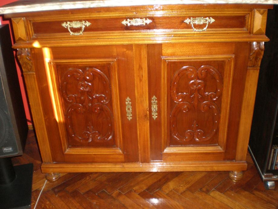 Prodajem tri komode iz vremena: dvije altdeutsch u stilu neorenesansa iz 1903.g. i neo-jozefina damen-komodu iz 1928.g. Sve su restaurirane i politirane. Materijal - furnir orah. Komoda dvovratna s jednom ladicom ima roze multikolorni mramor s reljefnim rubom, ušćuvan, bez napuklina i iz vremena; saćuvan 100% što je danas vrlo rijetko; dimenzije mramorne ploče 106x56 cm visina 86 cm. Komoda s 6 ladica je izuzetno dekorativna s visinom od 141 cm i širinom letvica krune od 84 cm. Komodica neo-jozefina damen-komoda bogata intarzijama u stilu jozefina i Lui XIV. Ploča izuzetno dekorativna i ušćuva. Pravi mali dragulj od komodice; dimenzije:95x46 cm s visinom od 81 cm. Sve bešlage iz vremena.