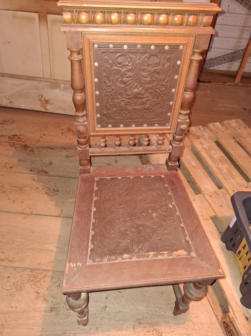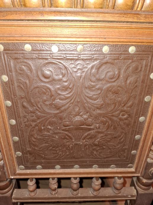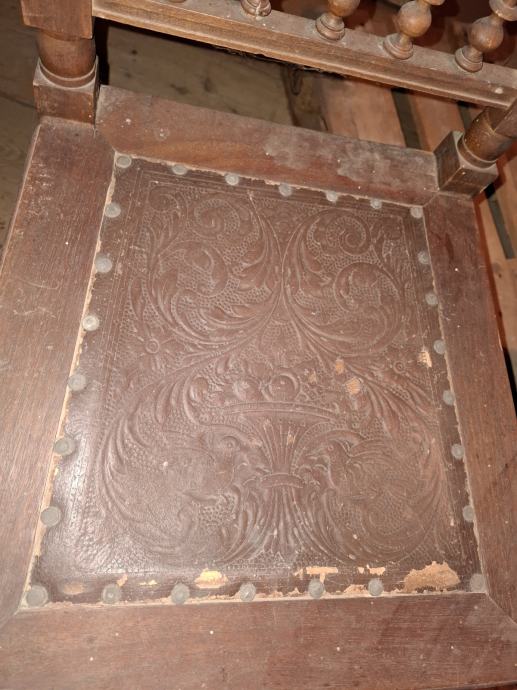 Prodajem izuzetno dekorativne antikne stolice u stilu španjolske neorenesanse s kraja 19. ili početka 20. stoljeća. Stolica je autentičan primjerak starog građanskog namještaja, savršena kao "statement" komad za radnu sobu, knjižnicu ili hodnik.
