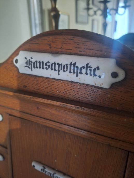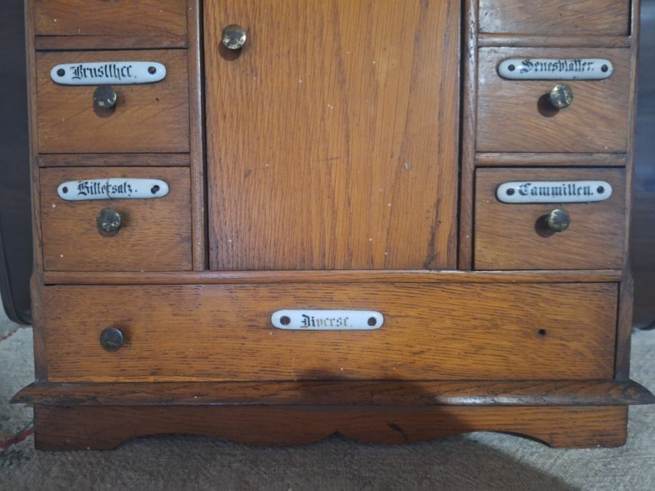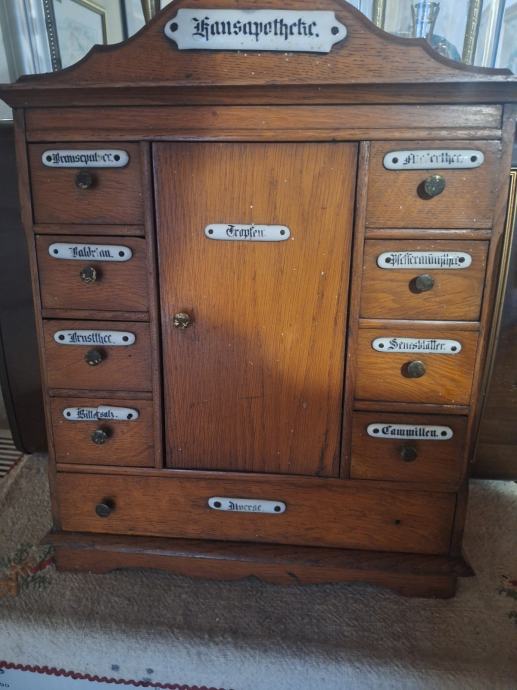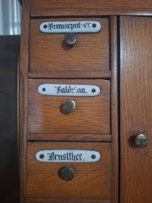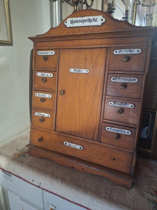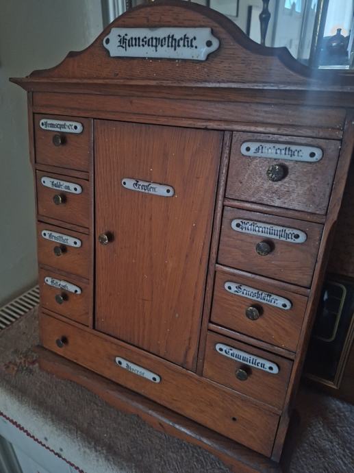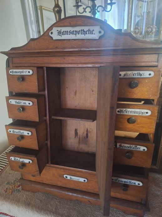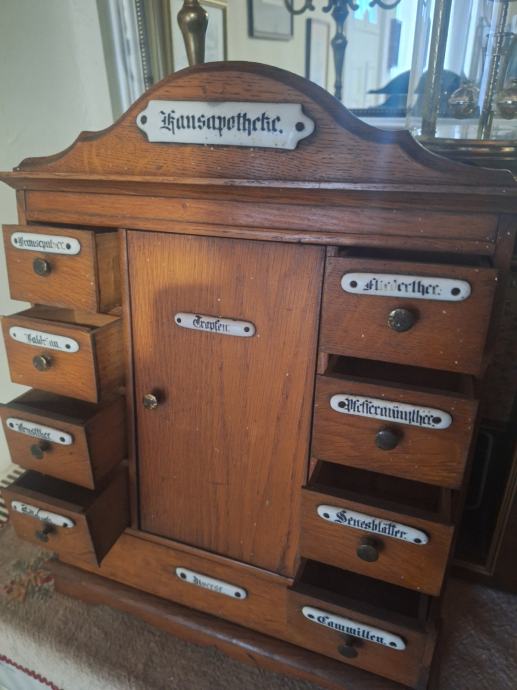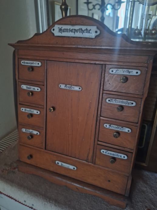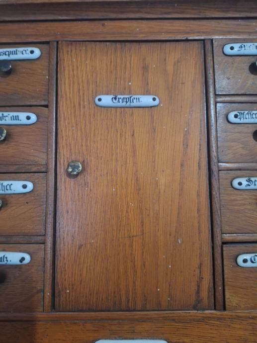 Prodajem antickni apotekarski ormarić sa više ladica i natpisnim pločicama na njemačkom jeziku (npr. kamilica, metvica, valerijana, anis).