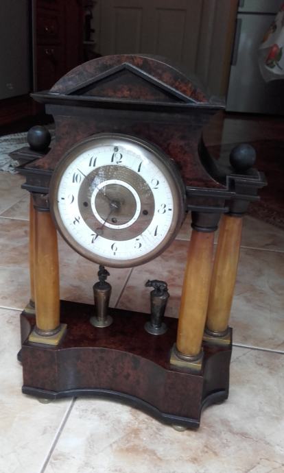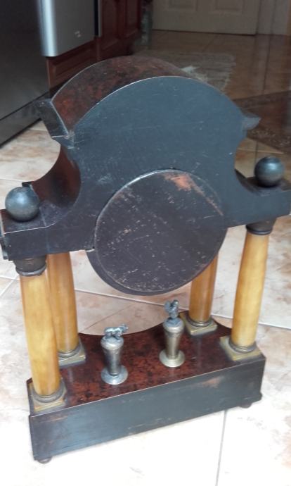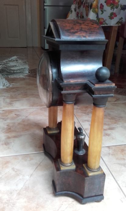 U Biedermeier stilu komodni sat s 4 stupa od egipatskog kamena s piramide - alabastera, korpus kompletan od furnira ružinog drva s dvije ukrasne drvene kugle, significiran grafitnom olovkom datum prvog servisa iz 1823. godine. Ručni rad.