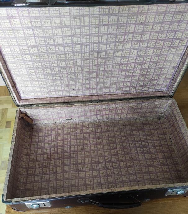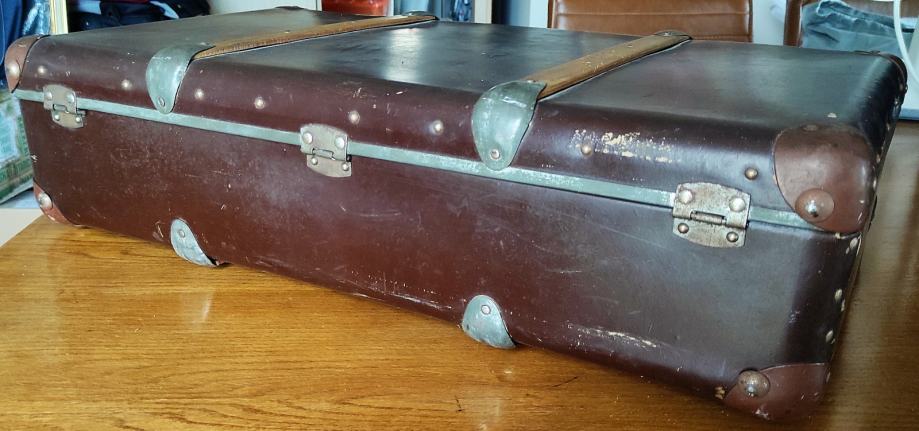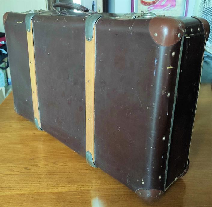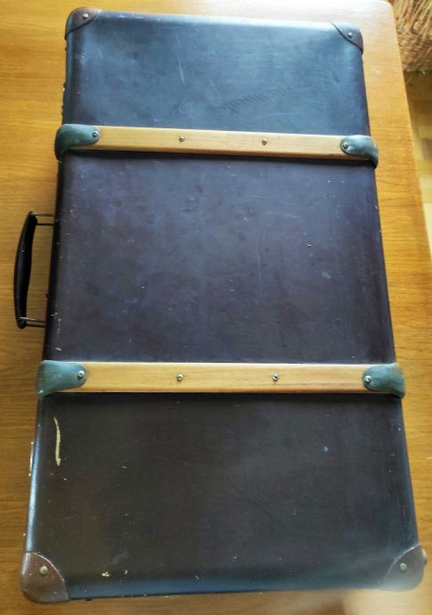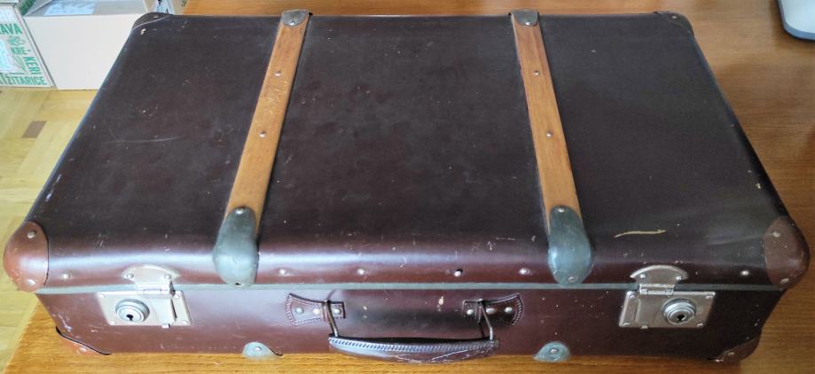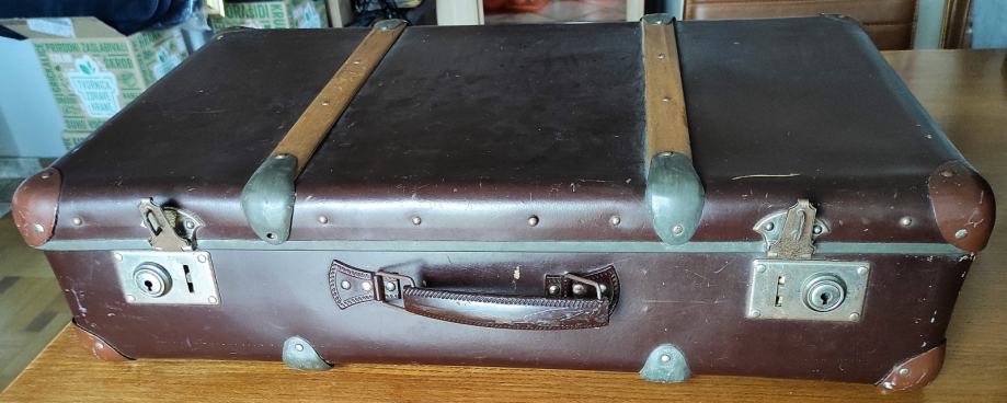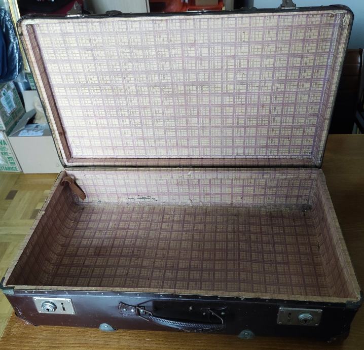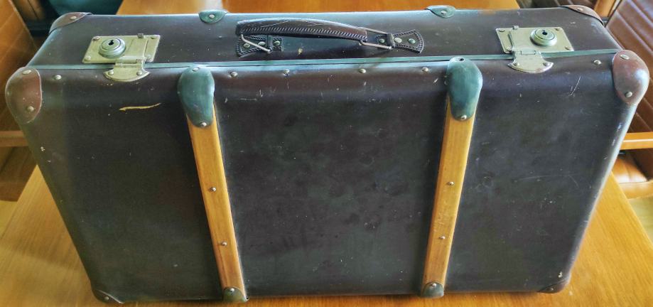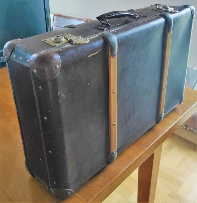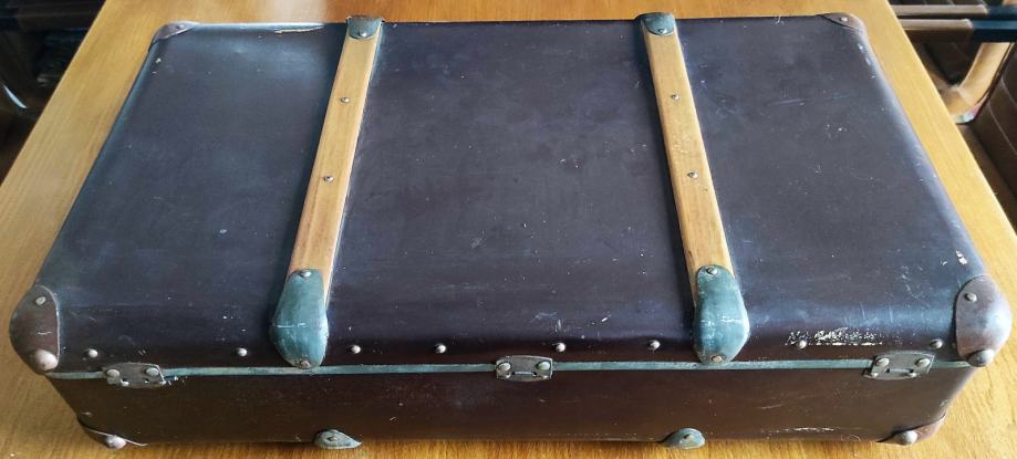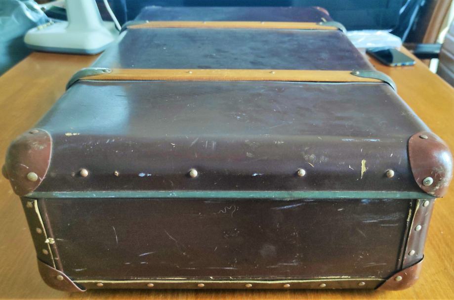 Antikni kofer, u originalnom stanju, tvrdi prešani karton, drvena i metalna ojačanja sa metalnim kopčama i zakovicama, izvorne starosti sa prijelaza 19. u 20. stoljeće.