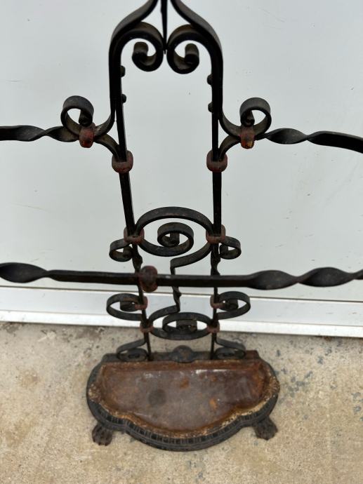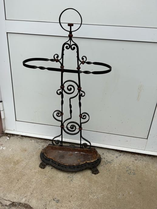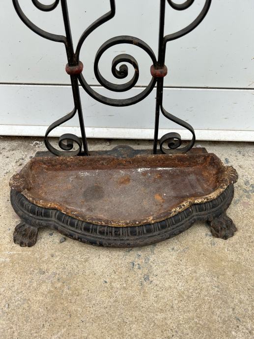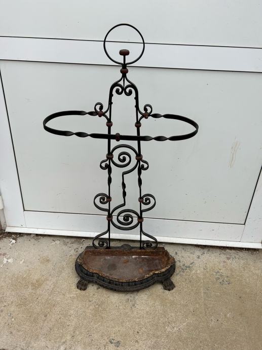 Kovani stalak za kisobrane u vrlo dobrom stanju sa originalnom posudicom za prikupljanje vode.