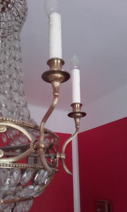 Luster je očišćen, mesingani i kristalni dijelovi su oprani i ispolirani a mesingani dijelovi su zaštićeni lakom protiv elemenata da zadrži izvorni sjaj. Luster ima s donje strane središnjeg vijenca još tri grla za još tri sijalice.