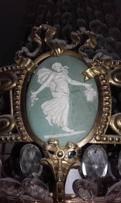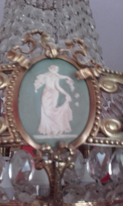 Prodajem iz kućne kolekcije zbog preseljenja antikni kristalni luster u stilu Empir cca 1920.godina, kompletan, s krunom i svim ukrasima, stropnom krunastom rozetom, s 6 svijeća, tri bočna reljefa od oniksa na velikom obruču s motivom plesačica, pun detalja. Dimenzije: visina 110cm, lanac 60cm, ukupno 170cm.