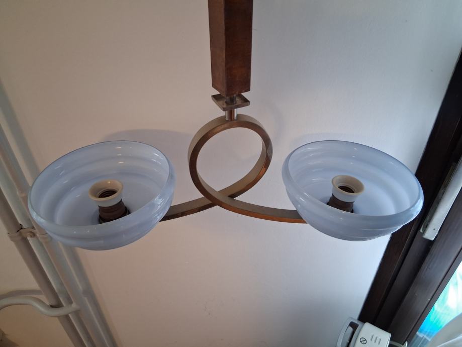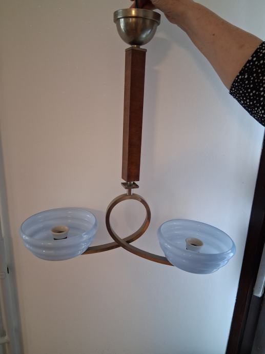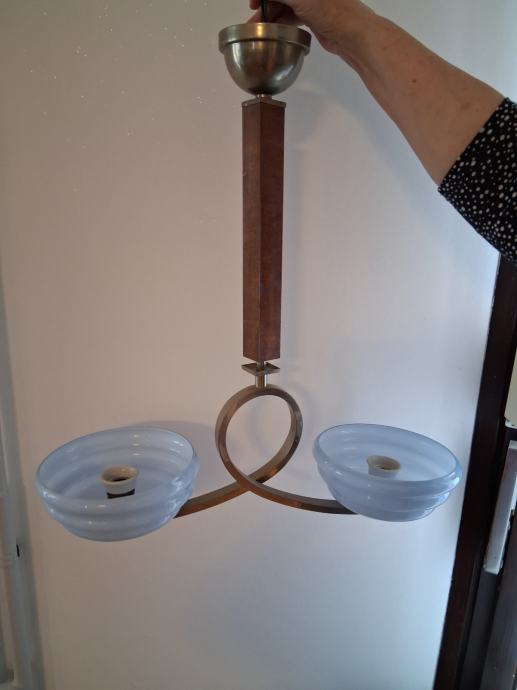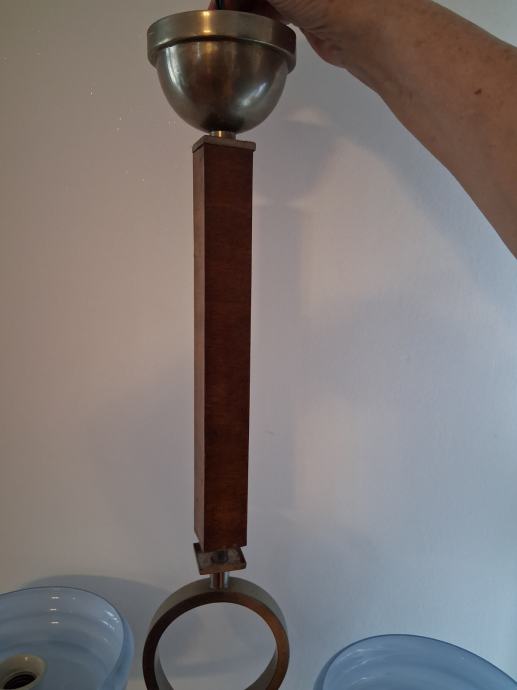 vintage/retro stropni luster s dvije staklene zdjele, kombinacija drva + mesinga/metalne konstrukcije + opal/blijedo plavo staklo. Stil podsjeća na 60-e / 70-e (mid-century ili jugoslavenski modernizam)