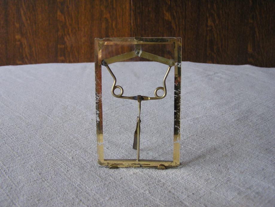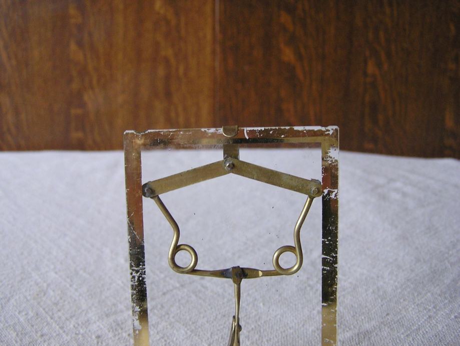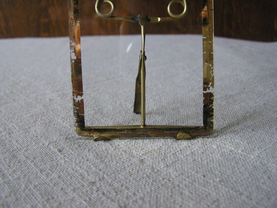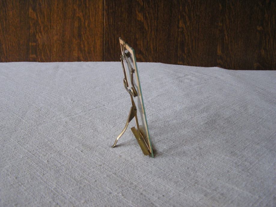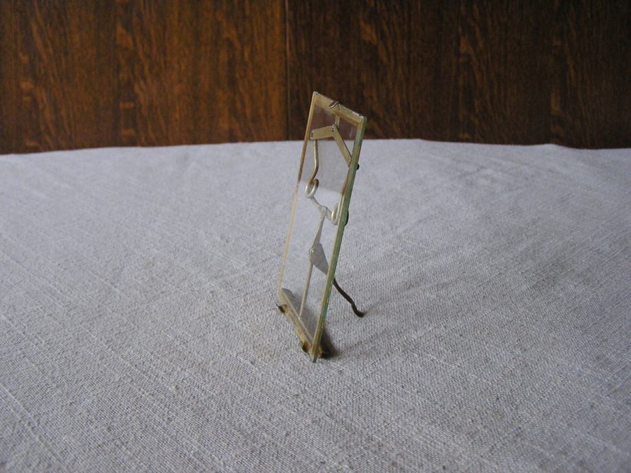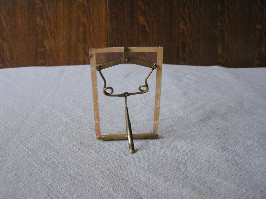 Manji mesingani okvir, držač za staklo ispod kojeg ide slika ili fotografija. Držač je sklopiv, no nema alku za objesiti na zid, pa je samo stolni. Star je oko 100 godina, no sve je u dobrom stanju osim zlatnog ruba na staklu koji se može popraviti. Sve je vidljivo na slikama. Mesing nije čišćen, pa ima nešto prirodne patine koja se može očistiti ako netko želi.