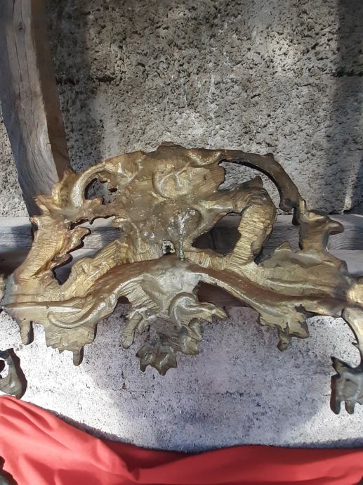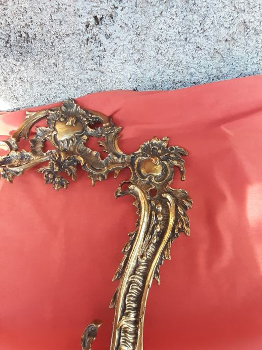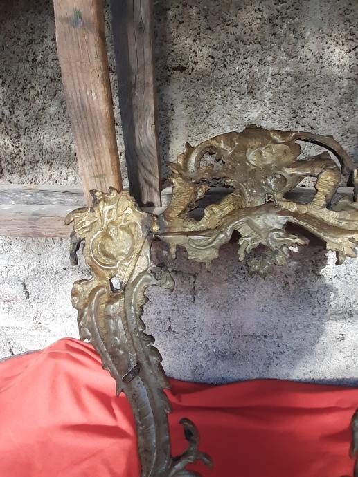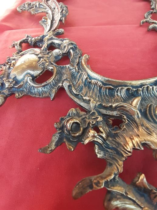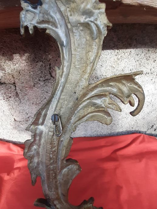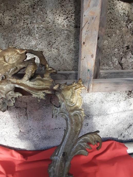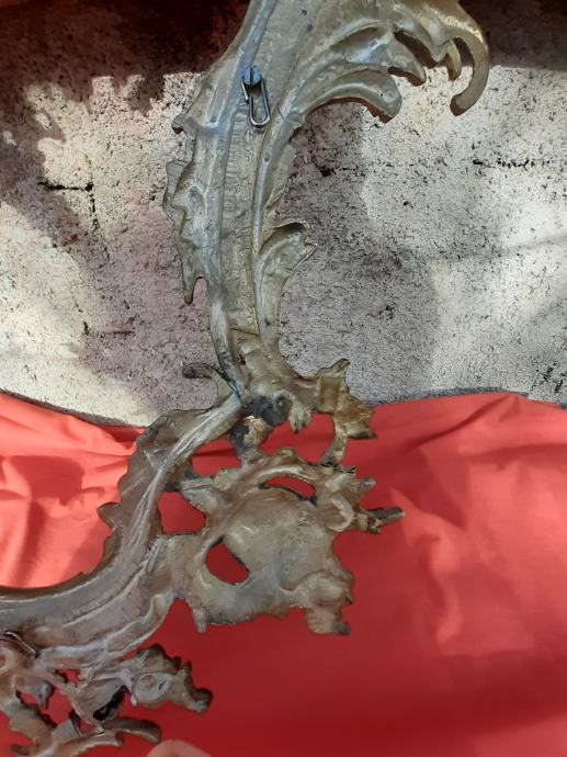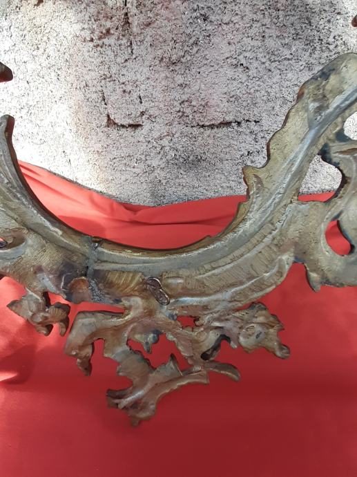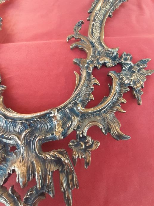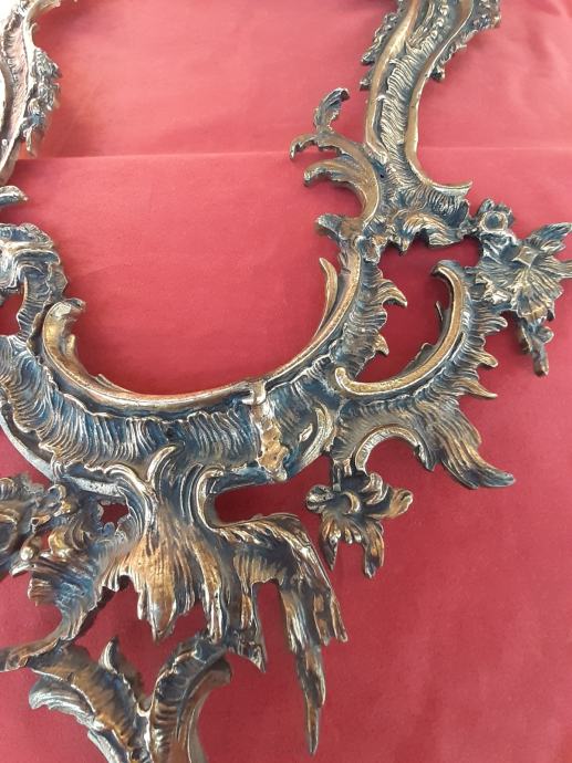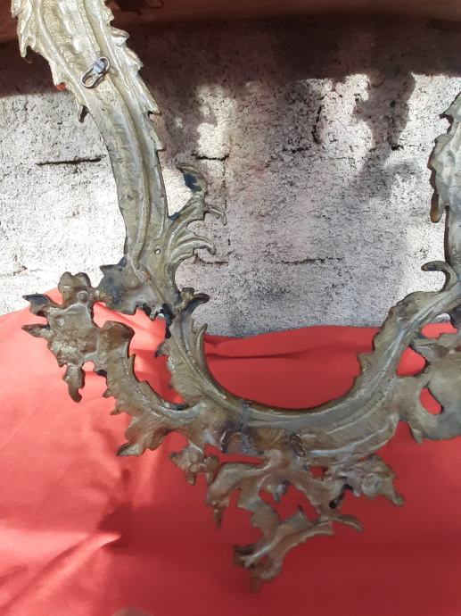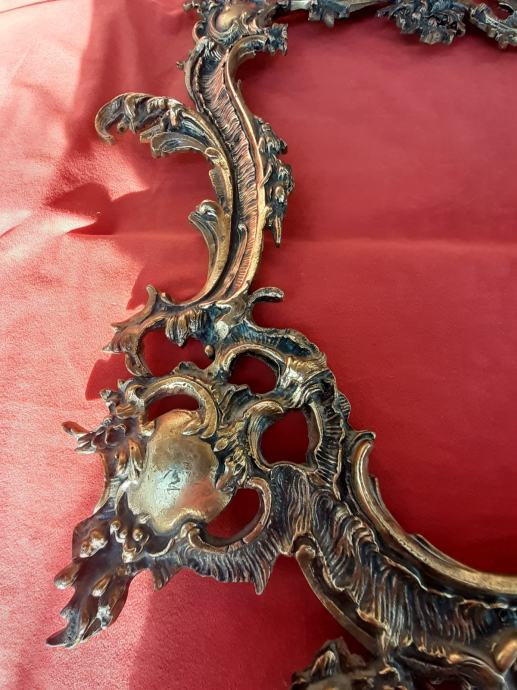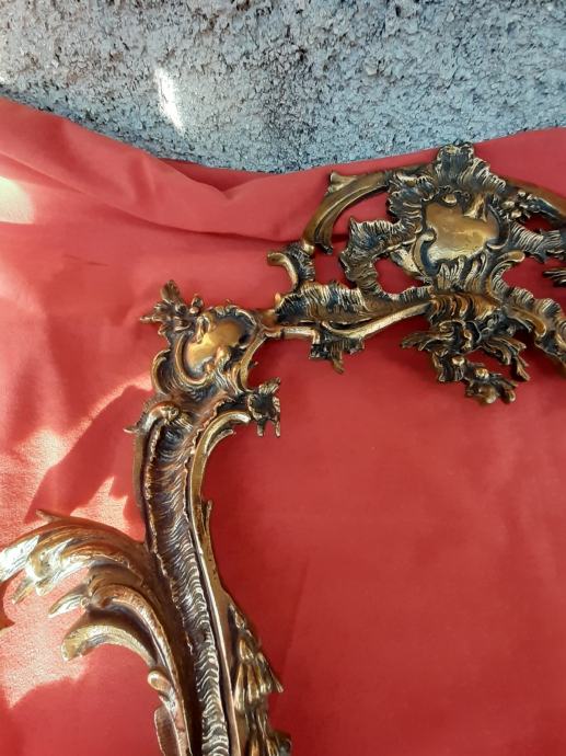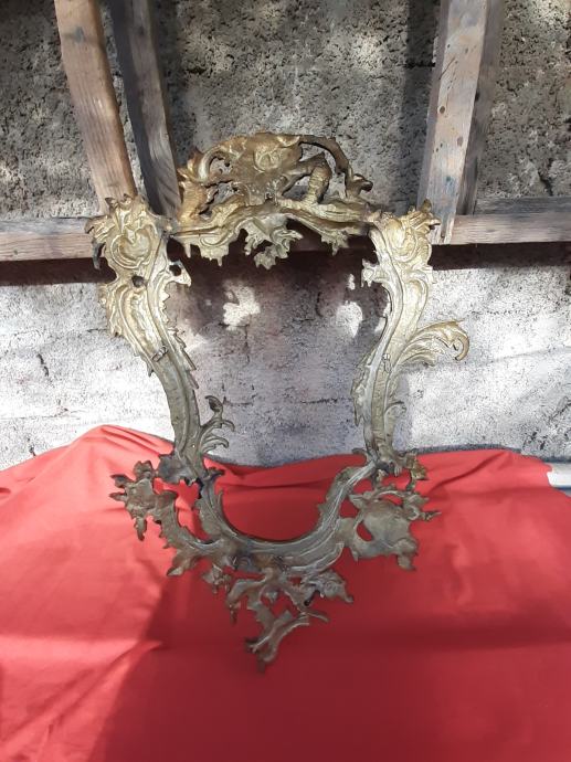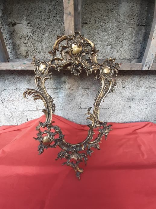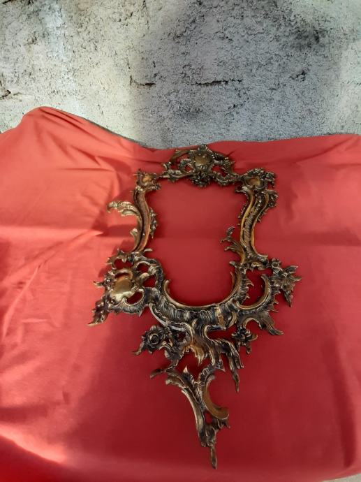 Prodaje se antikni okvir za ogledalo u rokoko stilu moguće izrađen od pozlaćene bronce dimenzija: najveća visina 75 cm i najveća širina cca 48 cm. Okviru nedostaje glavni nosač. Cijena okvira je 1300 eura. Mogućnost osobnog preuzimanja u Zadru. Kontakt broj mobitela 091 131 10 36.