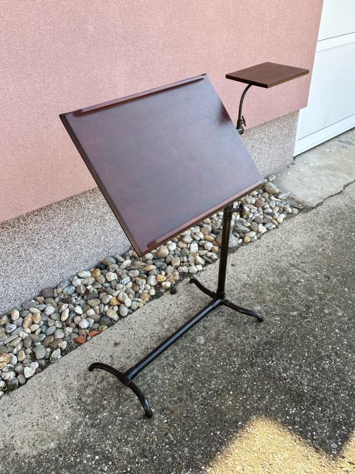 Stalak je napravljen id metala sa mehanizmima za stelanje visine i nagiba ploce, a ploce su drvene te furnirane mahagonij furnirom.