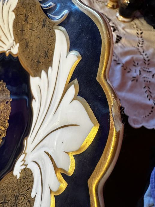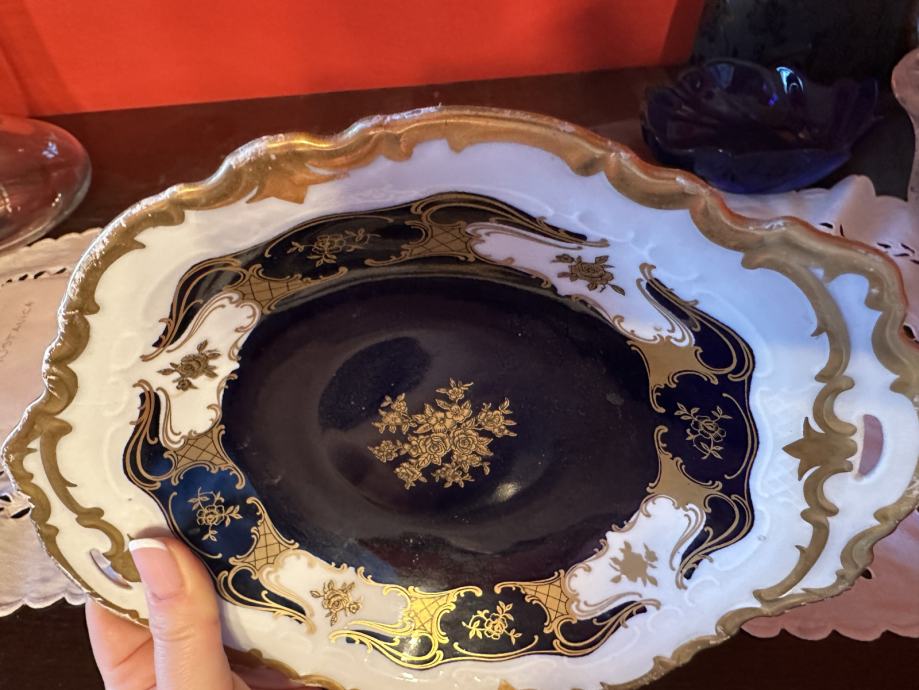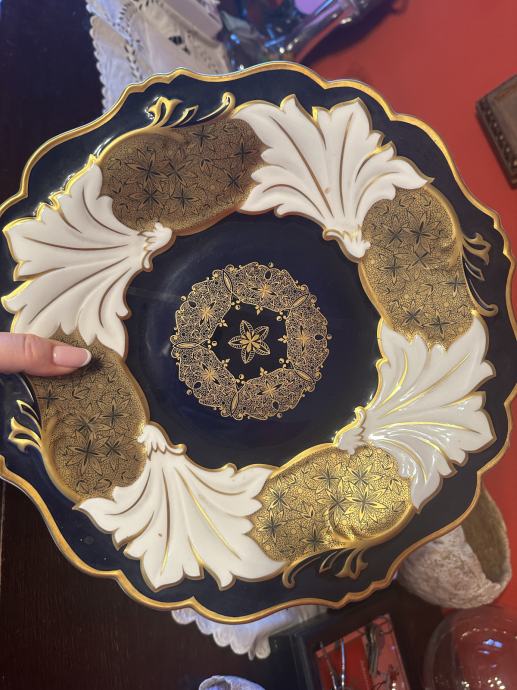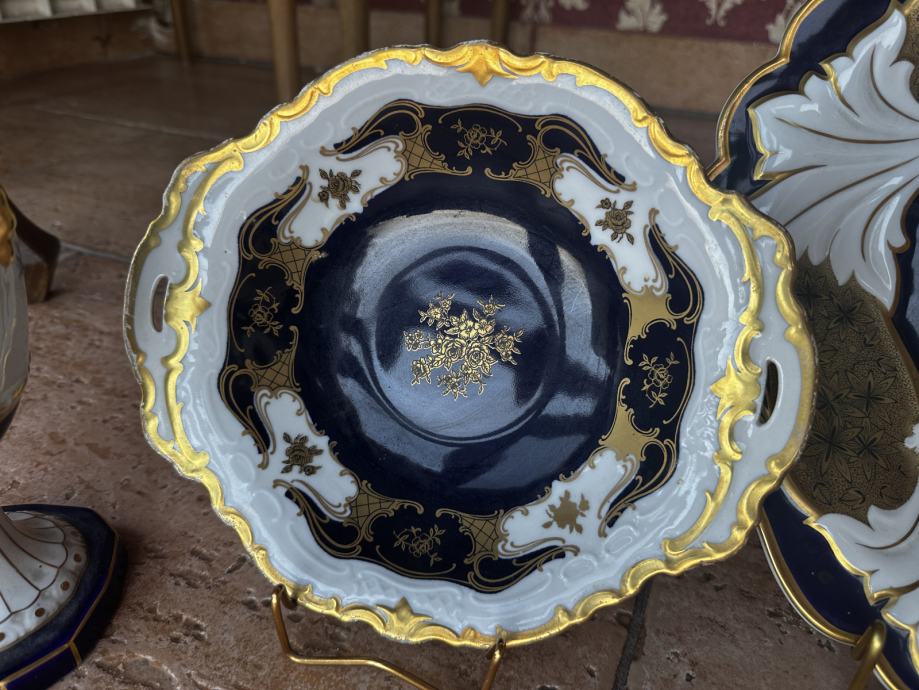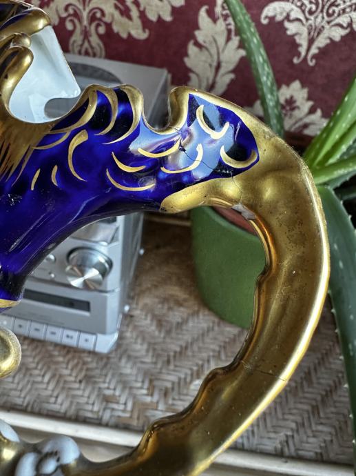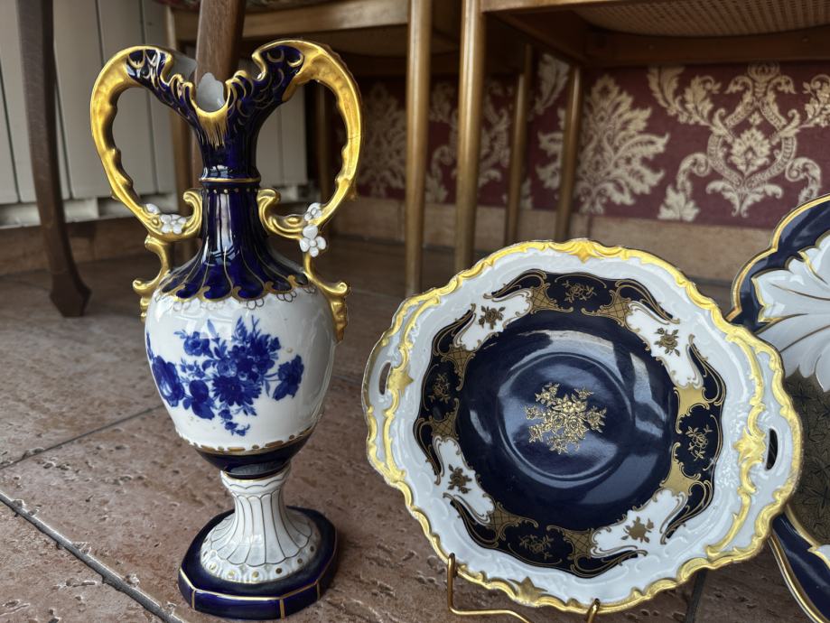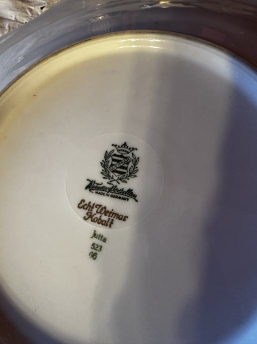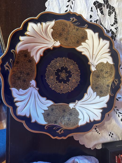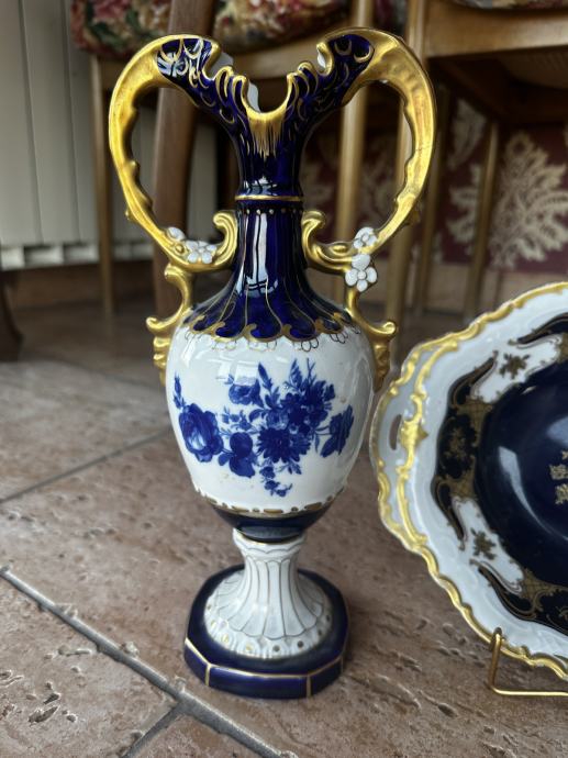 Ali kad stoju na polici ništa se ne vidi, kao da su nove. Jako lijepo za vašu kredencu. Cijena za veći tanjur Echt Weimar Kobalt Jutta je 50 eura. Za vazu Royal Dux je 50 eura. Za manji tanur Reichenbach (22k zlato) je 70 eura.