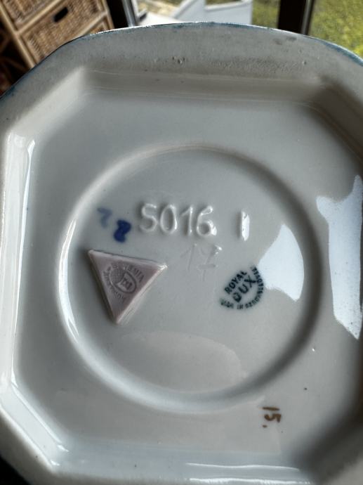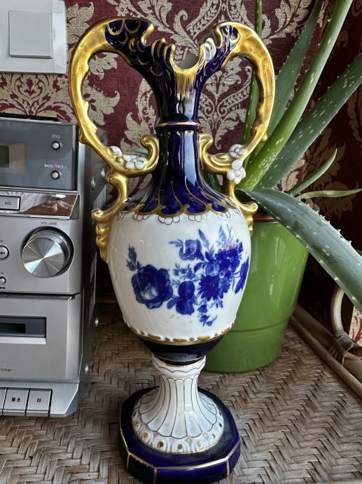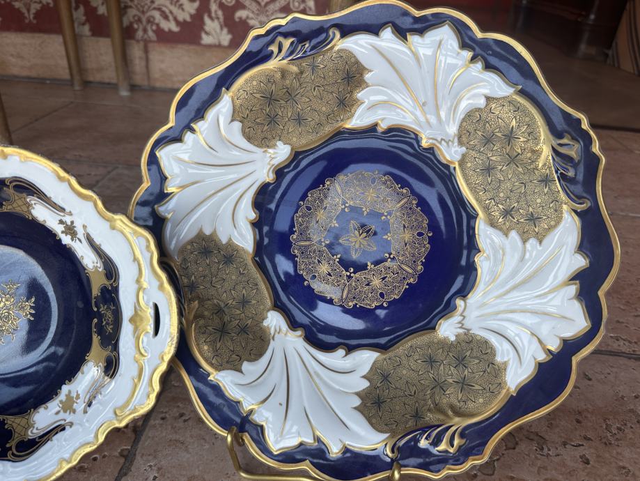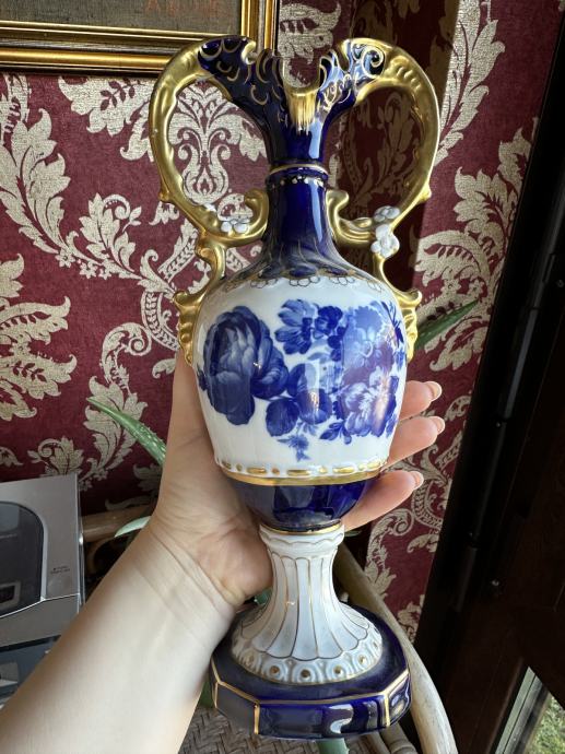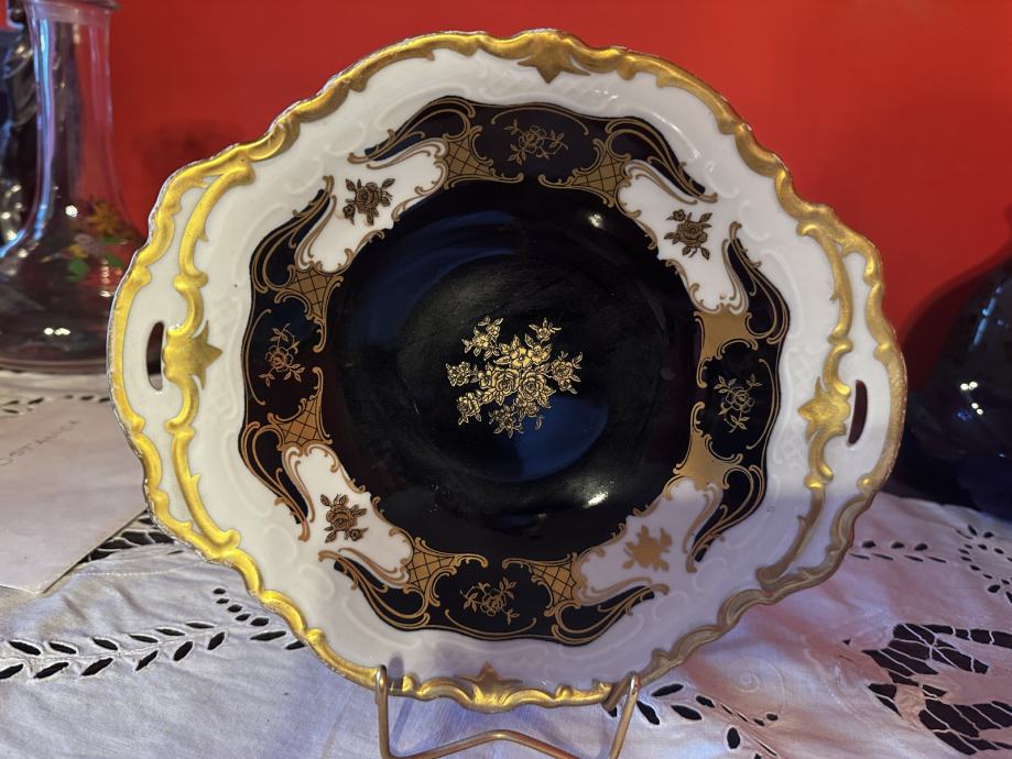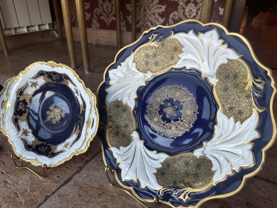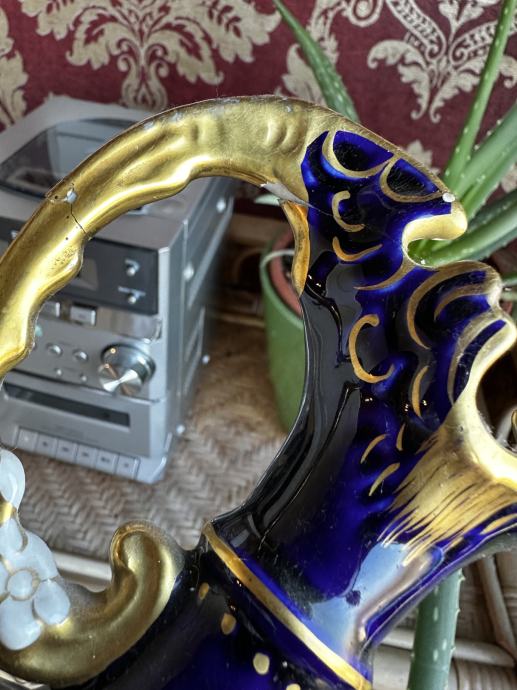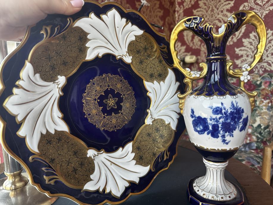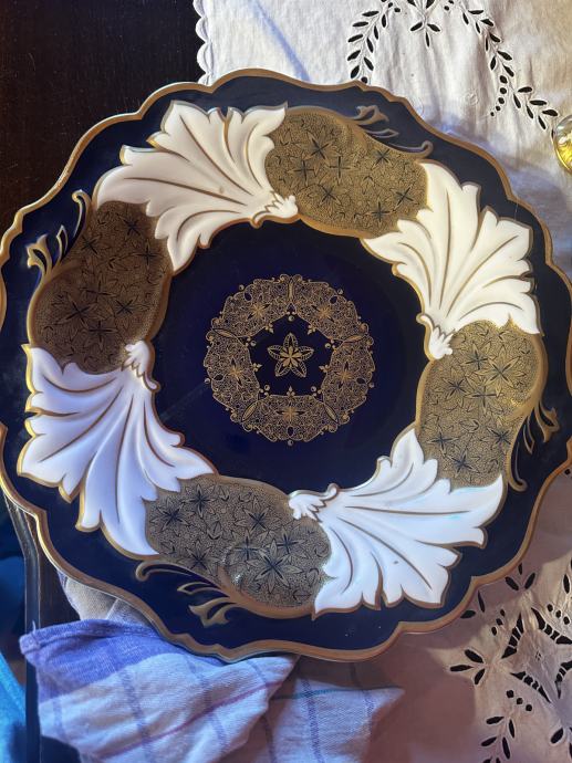 Ali kad stoju na polici ništa se ne vidi, kao da su nove. Jako lijepo za vašu kredencu. Cijena za veći tanjur Echt Weimar Kobalt Jutta je 50 eura. Za vazu Royal Dux je 50 eura. Za manji tanur Reichenbach (22k zlato) je 70 eura.