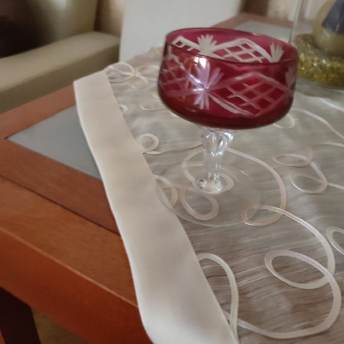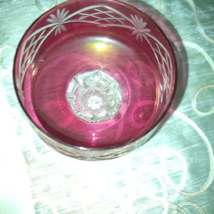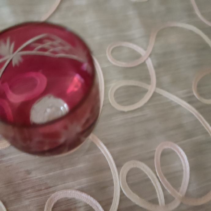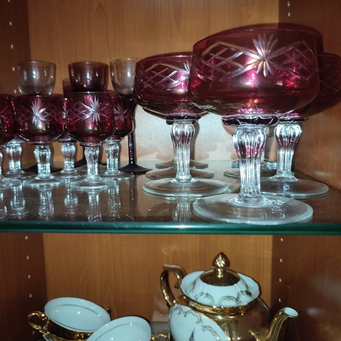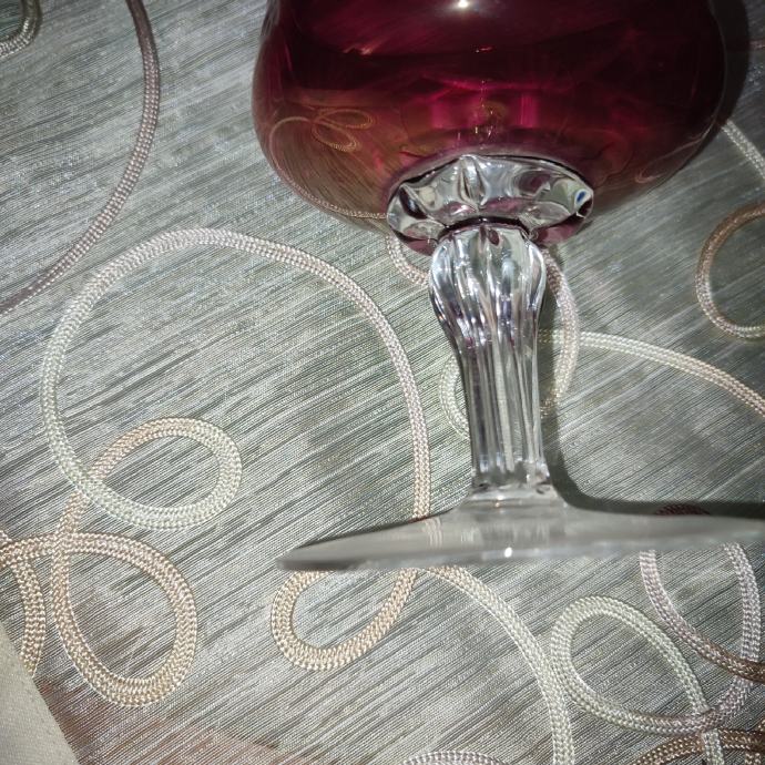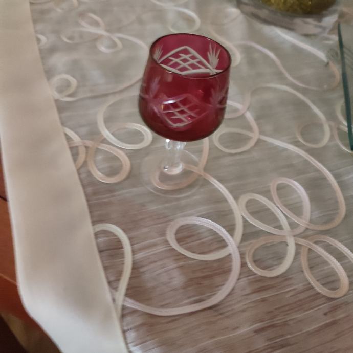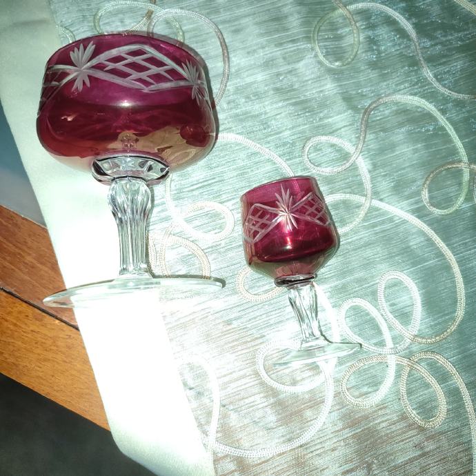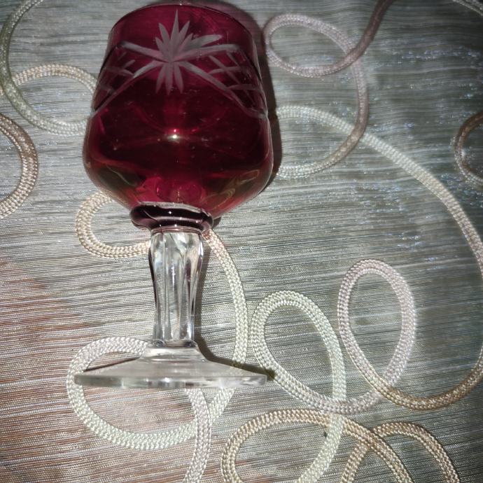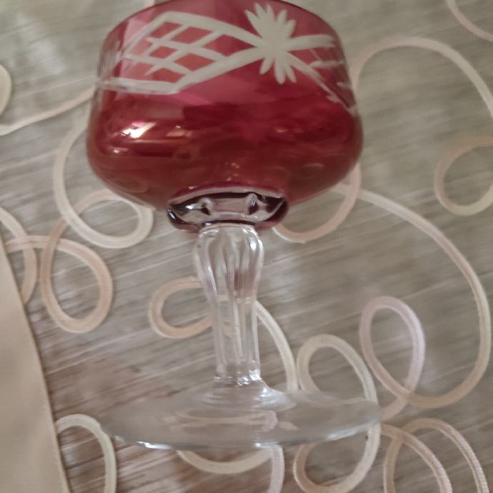 Kristalne, luxuzne, brušene, vintage čaše, Murano, u crvenoj boji, nikada korištene, čuvane kao suvenir, kupljene u Italiji, stare oko 80 godina ili više, prodajem zbog selidbe u manji prostor.