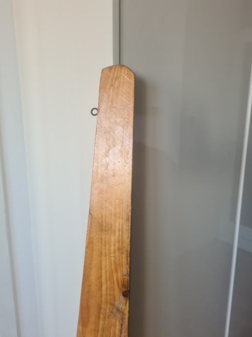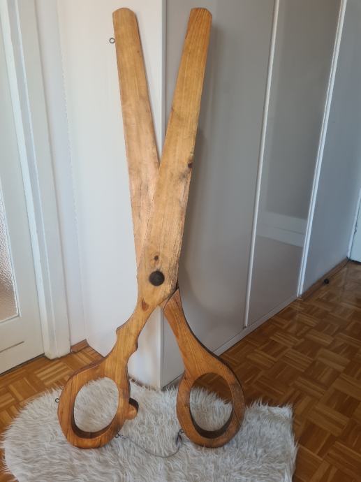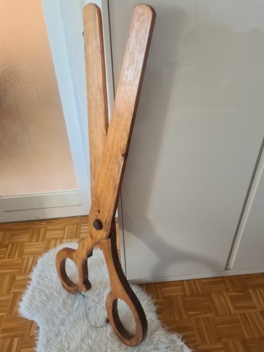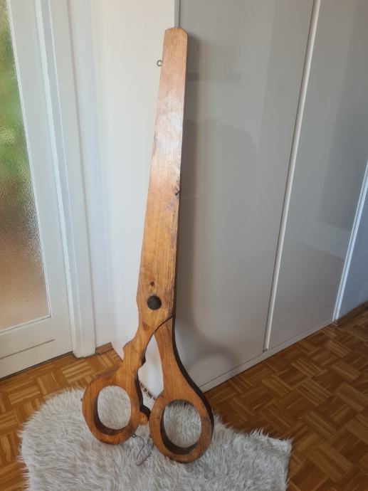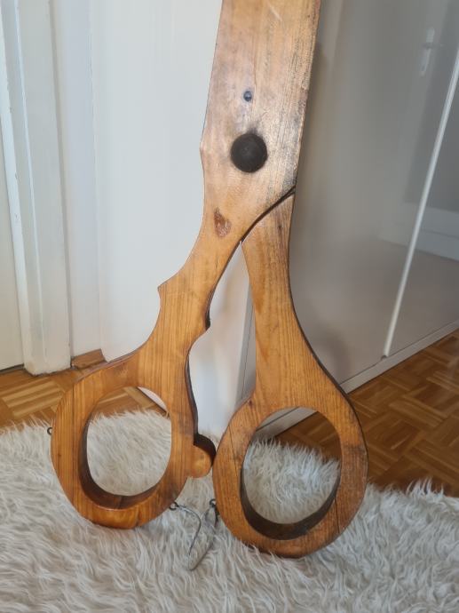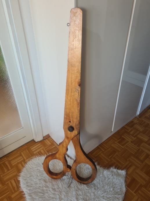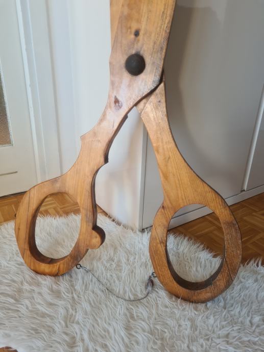 Antikvitetne drvene škare, sa mehanizmom, idealne za izloge, te ukrase na zidu. Imaju kukice za objesiti na zid. Ručni rad. Dimenzije 141x50cm.