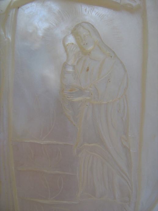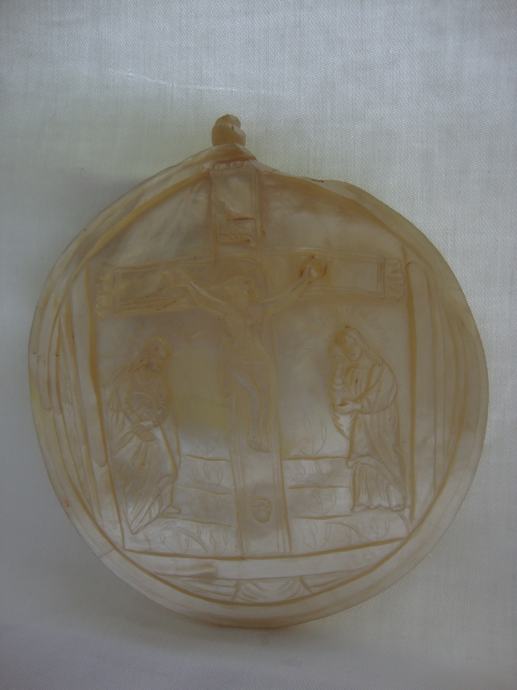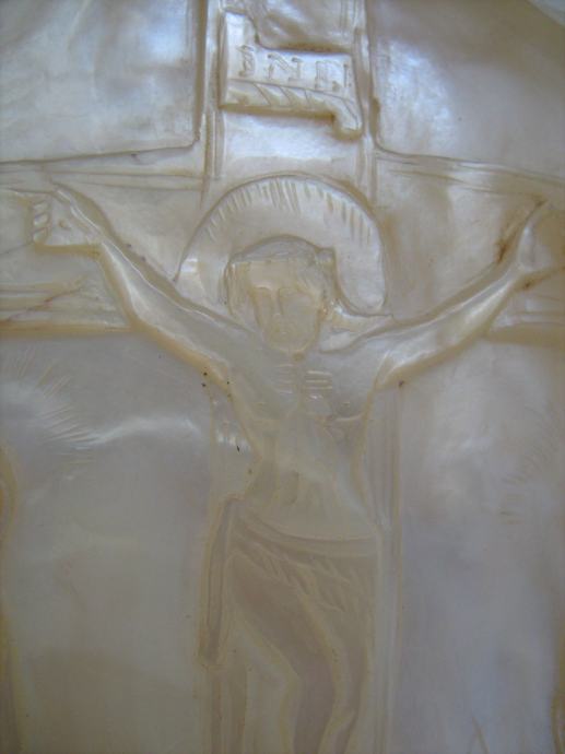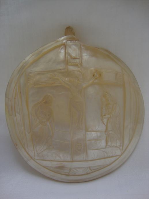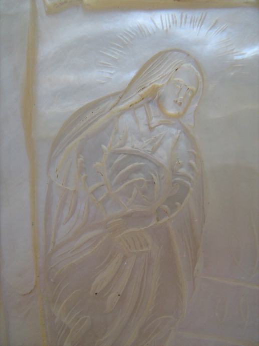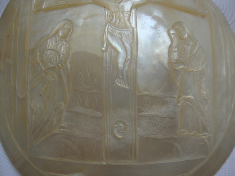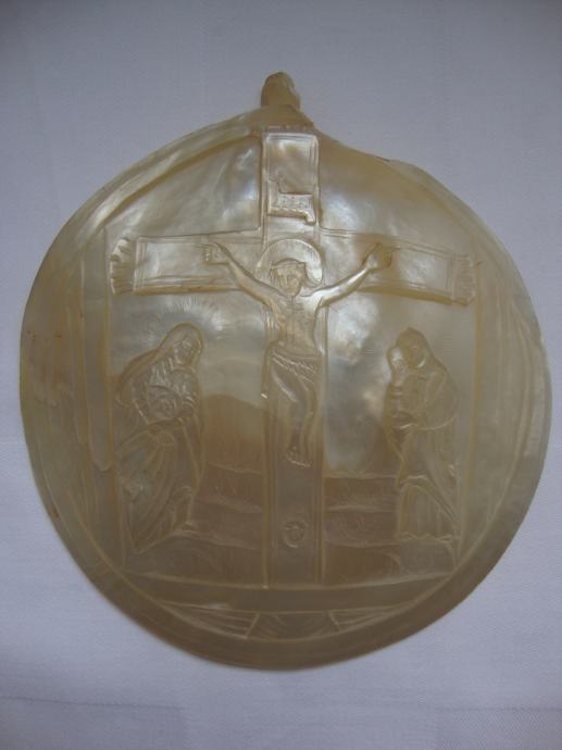 Ikona od sedefa, izrađena u 19. stoljeću ručni vrhunski rad u sedefu reljefno,motiv sa raspelom Isusom Kristom te Mariom i Josipom Jeruzalemska škola - vrh sa rupicom za obijesti o zid - stanje izvrsno,vrijednost povijesna , sakralna relikvija
