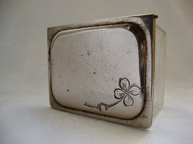 Krasna stara nejmačka kutija izrađena od kristalnog masivnog stakla te metalnim posrebrnim poklopcem ukrašena gravurom cvijetom djeteline