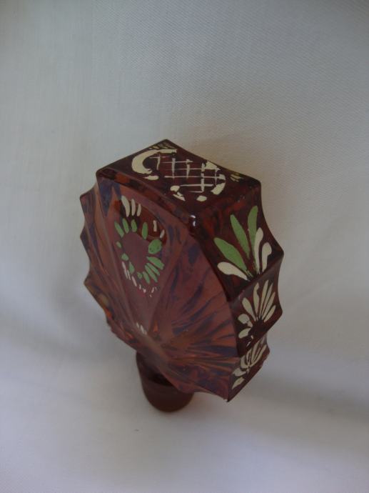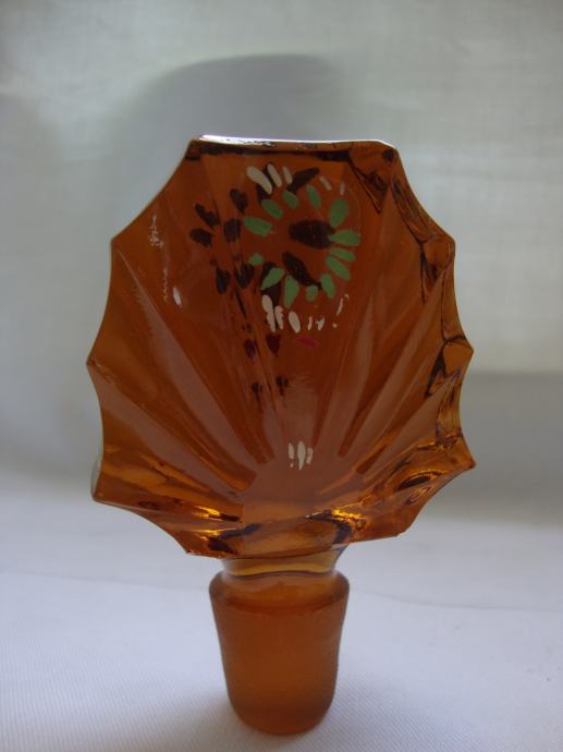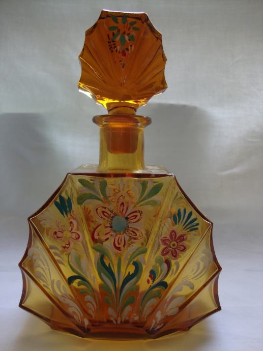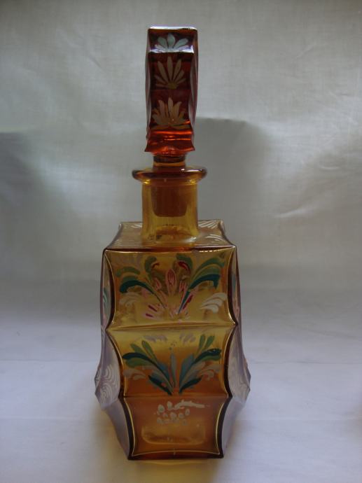 Set sa predivnom bocom od žutog stakla ručno oslikano cvijeće tijelo lepezastog oblika, stliski čep(zalazak sunca ) ukupne visine:21,5 cm x 13,5 cm širina x 9 cm debljine - zvana zalazak sunca