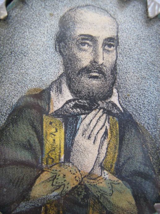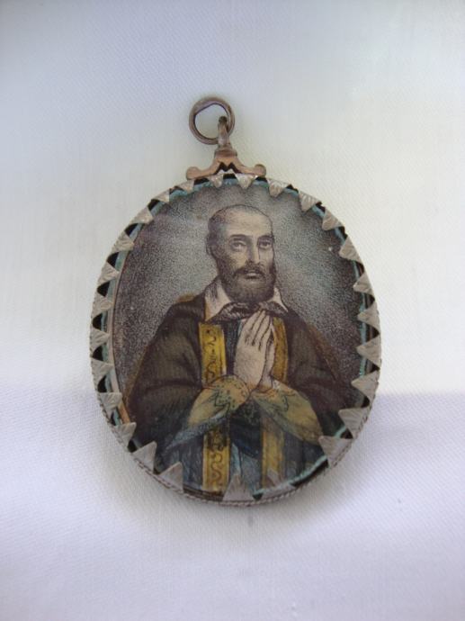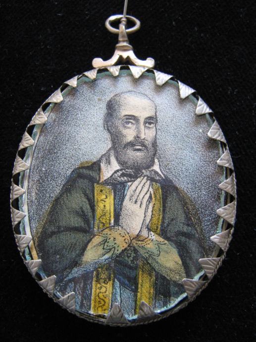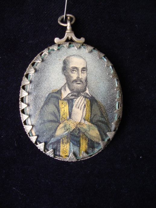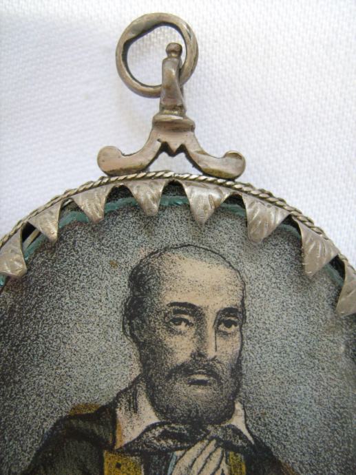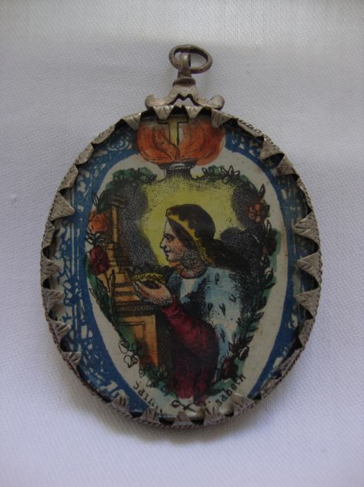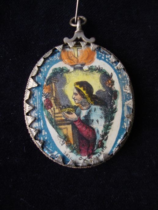 Srebrni privjesak medaljon relikvijar iz 18. stoljeća sa sličicom Svete Elizabete u ex votovom srcu i Franje Asiškog ručno oslikane sa tušom