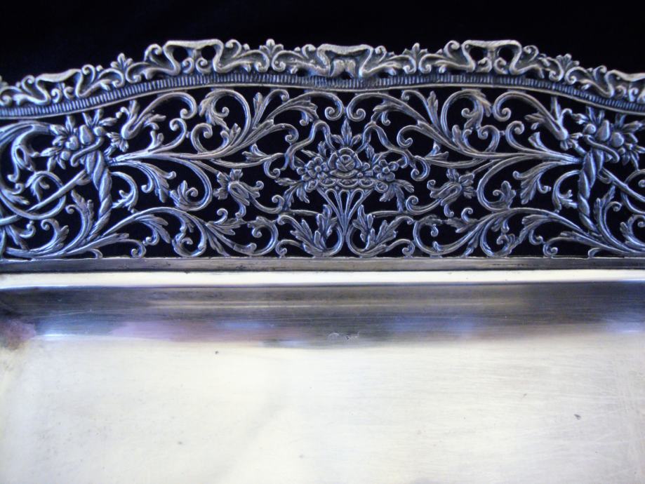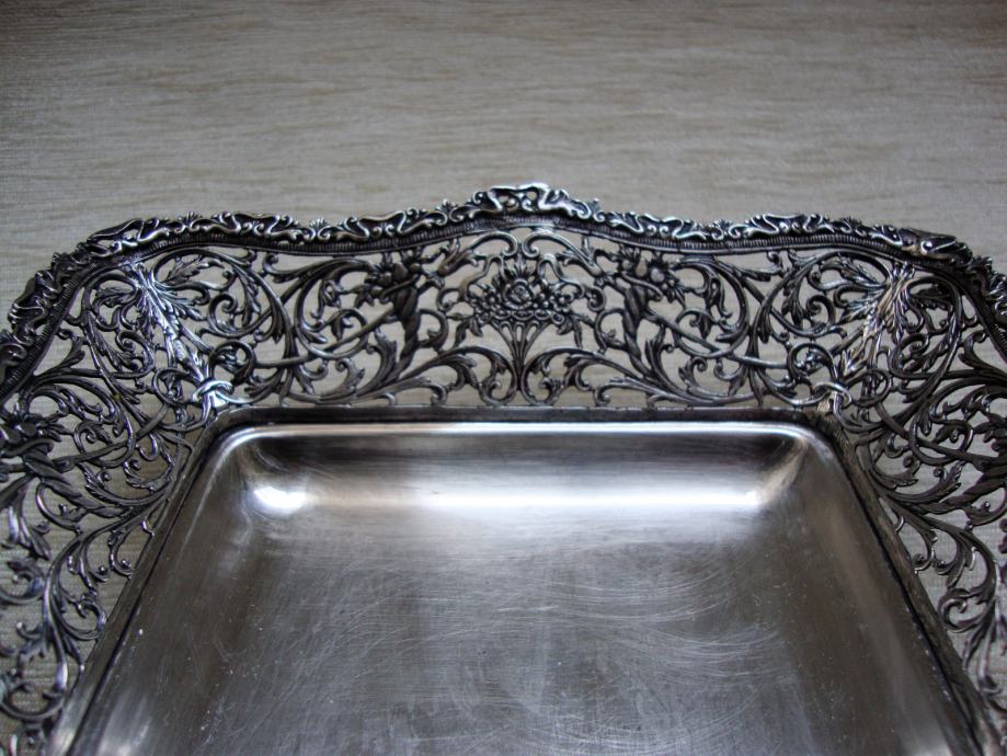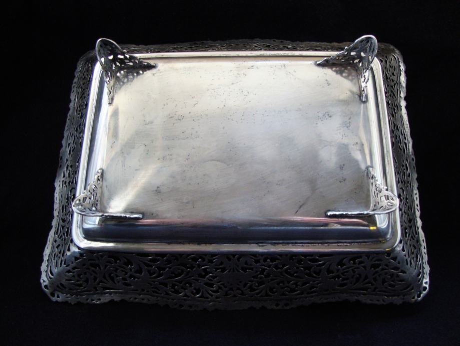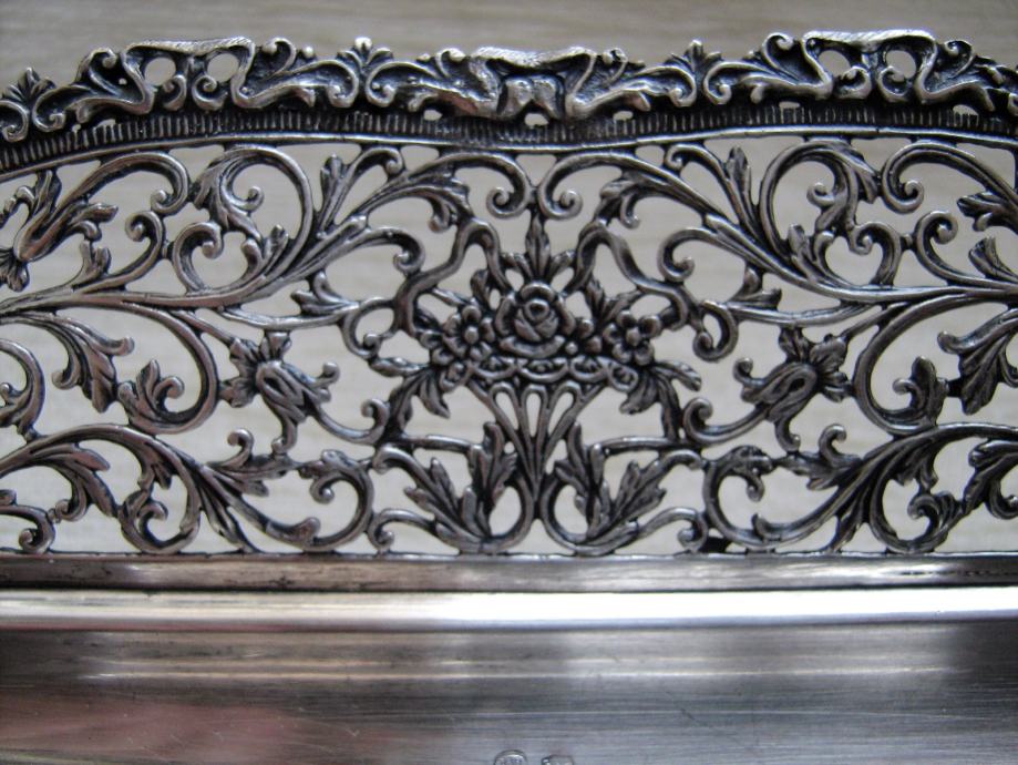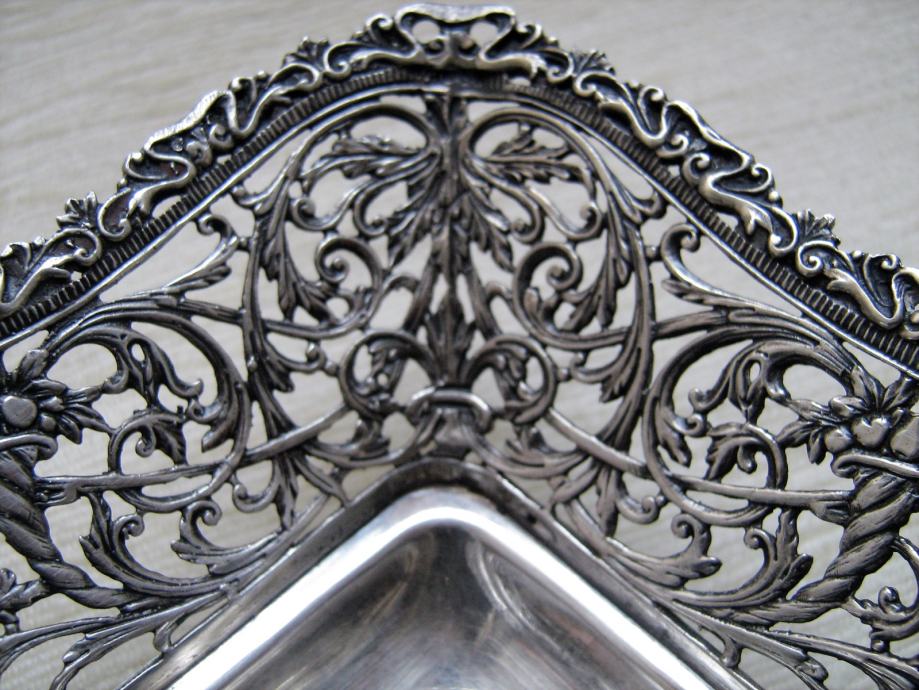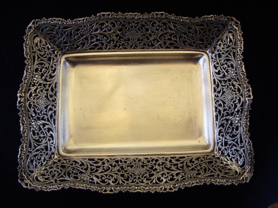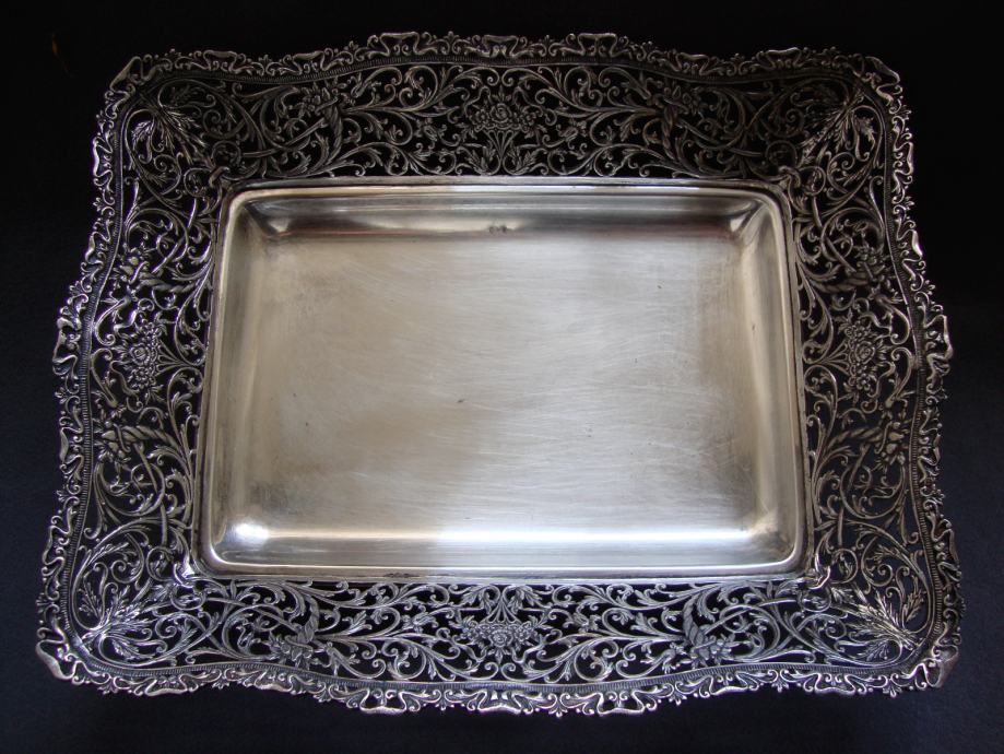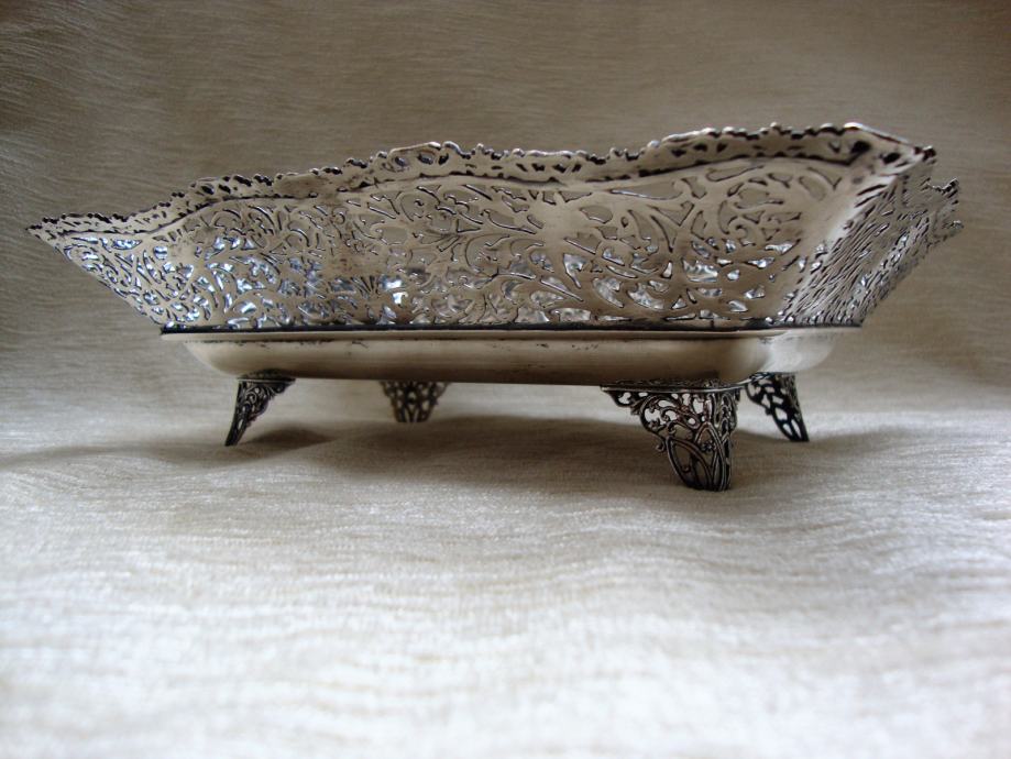 Veoma stara srebrna pravokutna košara, ručni rad kovano cvijetni dezen , nogice - izrađeno od srebra 800 sa žigom majstora