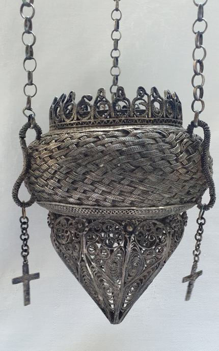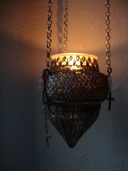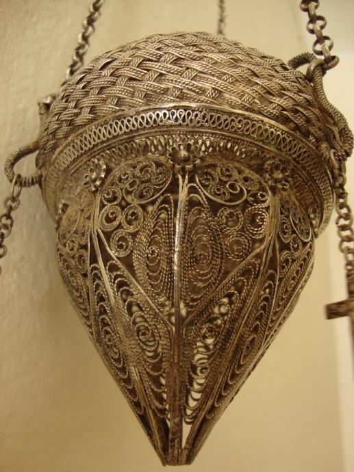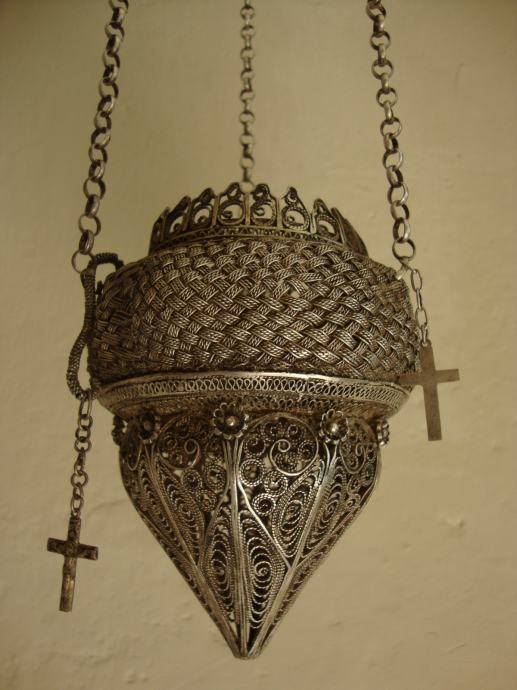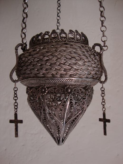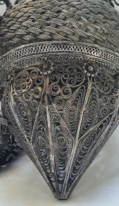 Predivno jako staro kandilo uljna lampa "Vječno svjetlo" bogato ručno izrađeno u tehnici filigran od srebrne žice ,preko 100 godina starosti