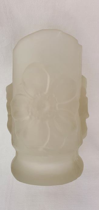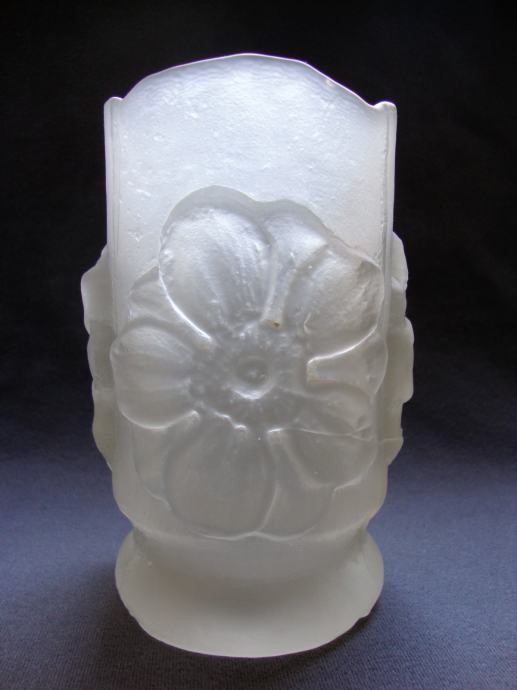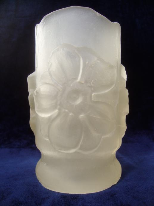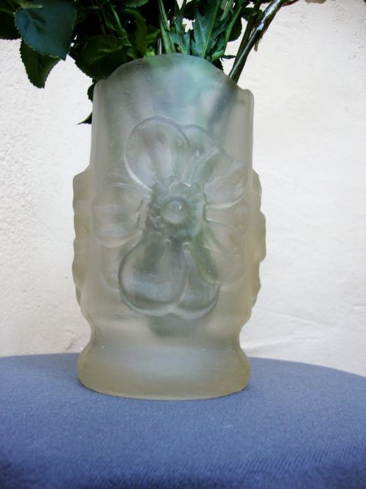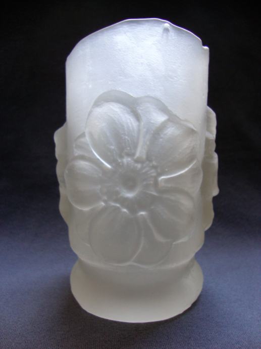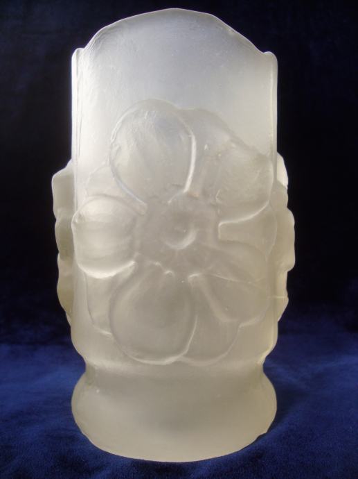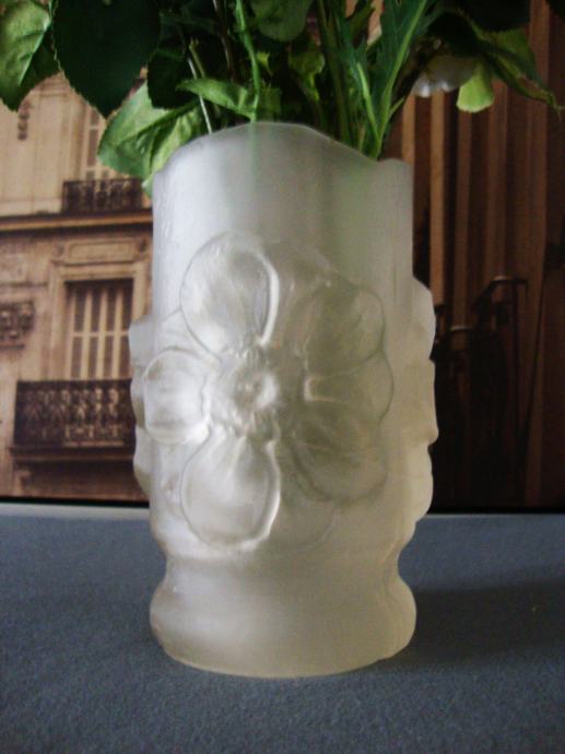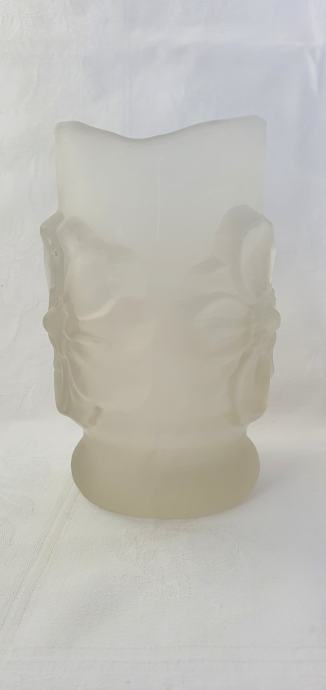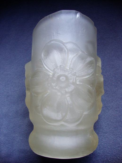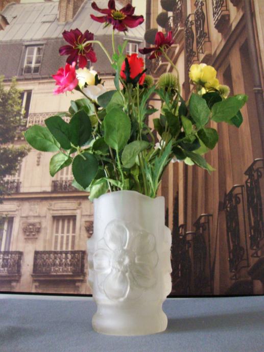 Reljefna tri velika cvijeta na tri stranice uokolo vaze mutno staklo podjeća na velik komad smrznutog leda