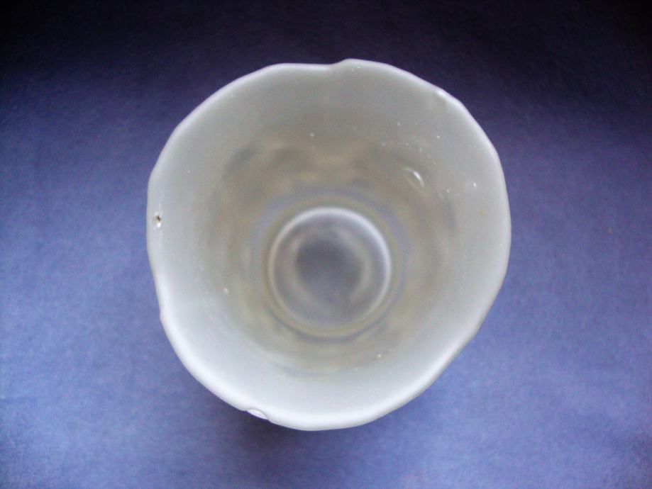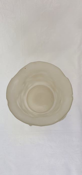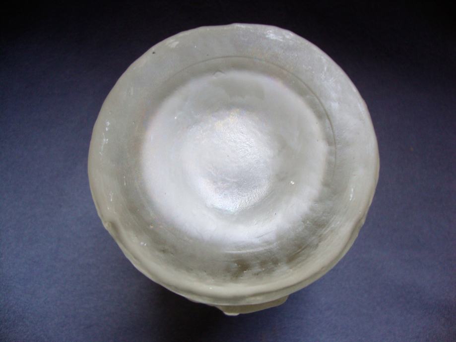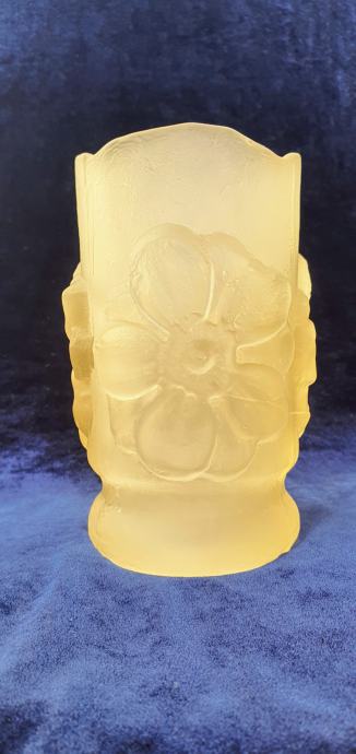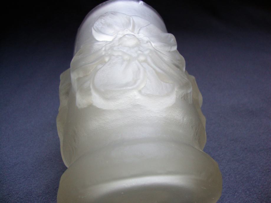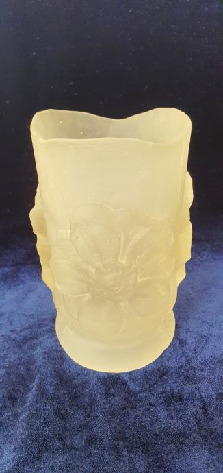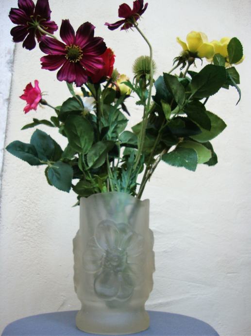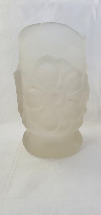Reljefna tri velika cvijeta na tri stranice uokolo vaze mutno staklo podjeća na velik komad smrznutog leda