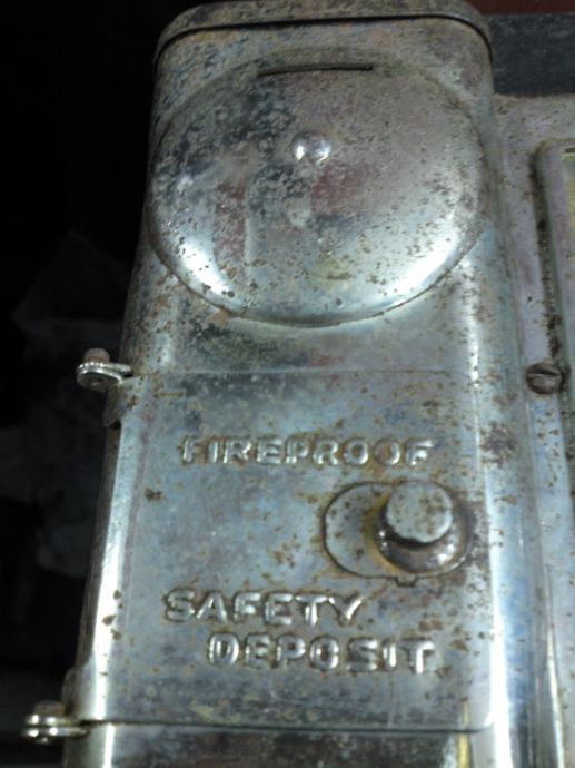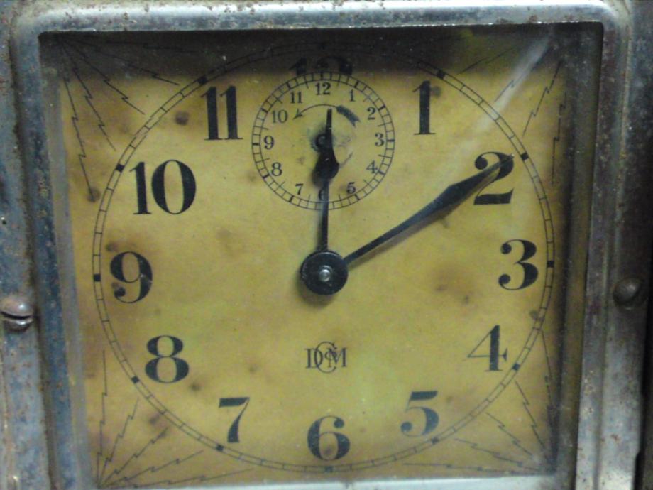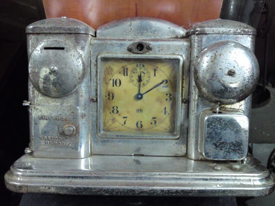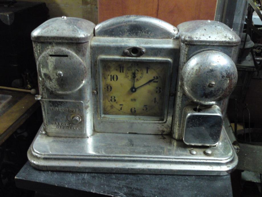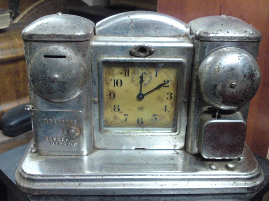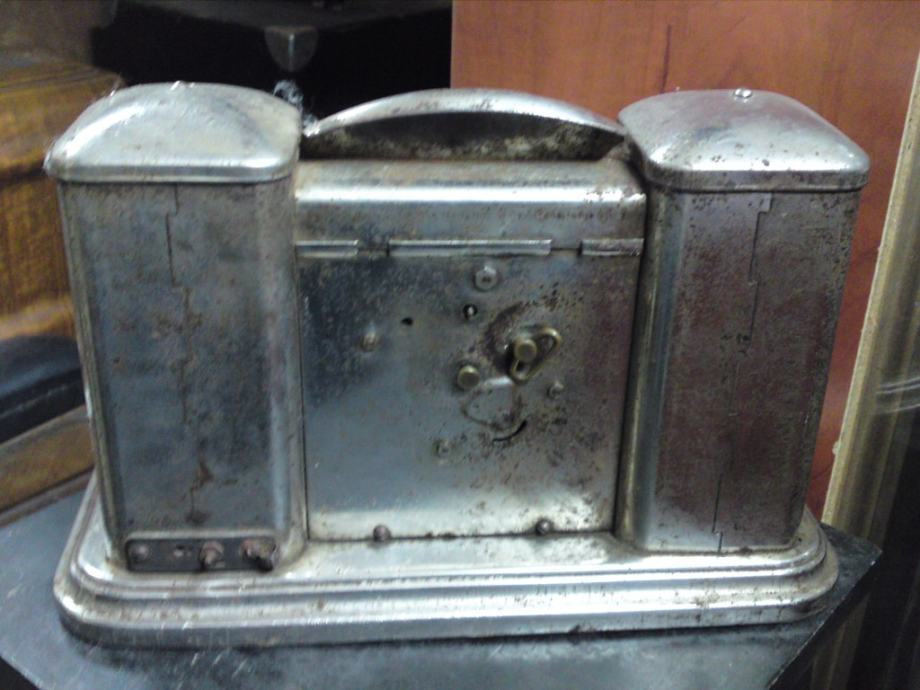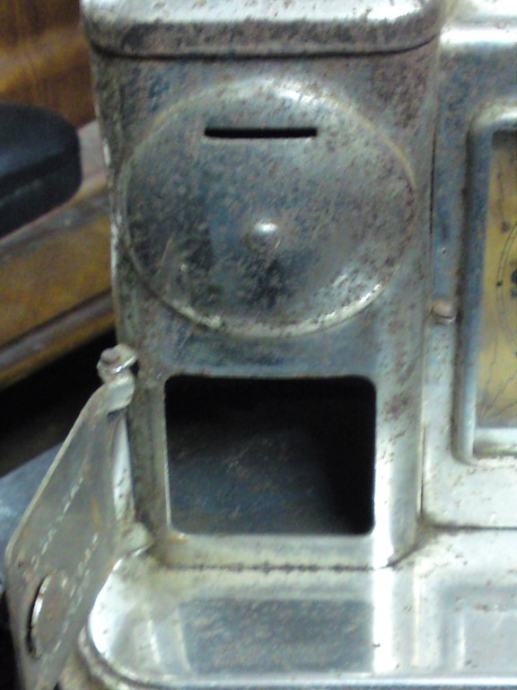 Stari metalni stolni sat, Chichago, patent. br., neobičan - radi na kovanice, vatrootporan, raritet, patent: 12.1810.