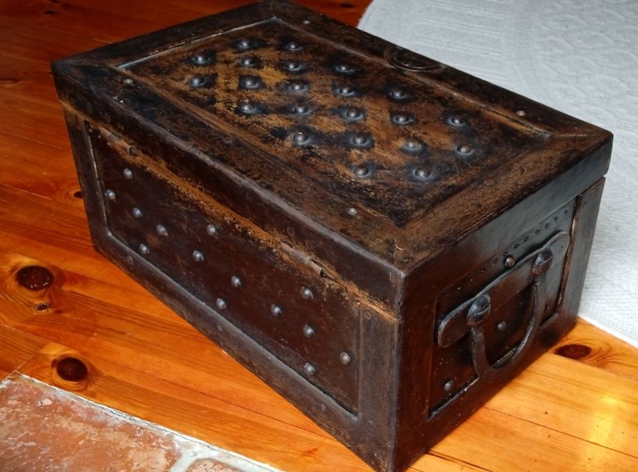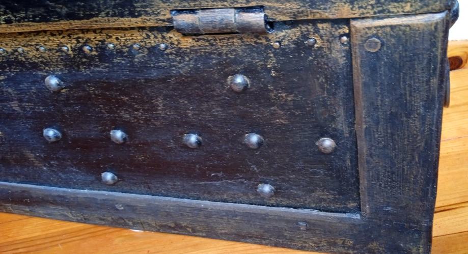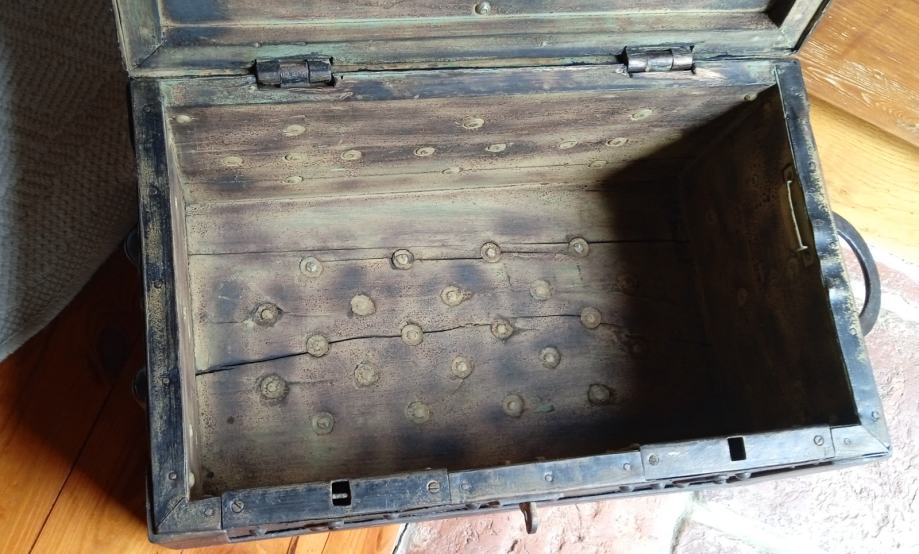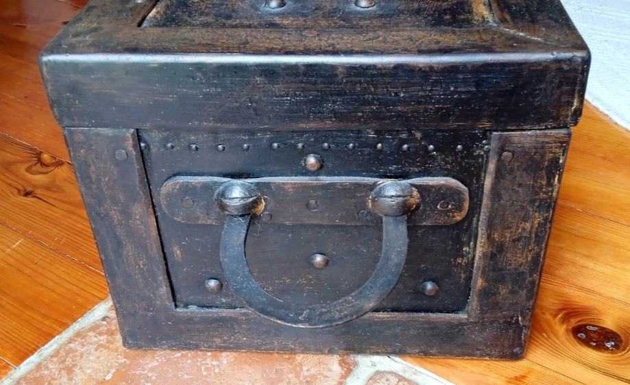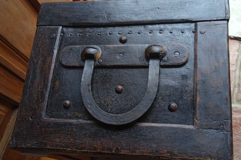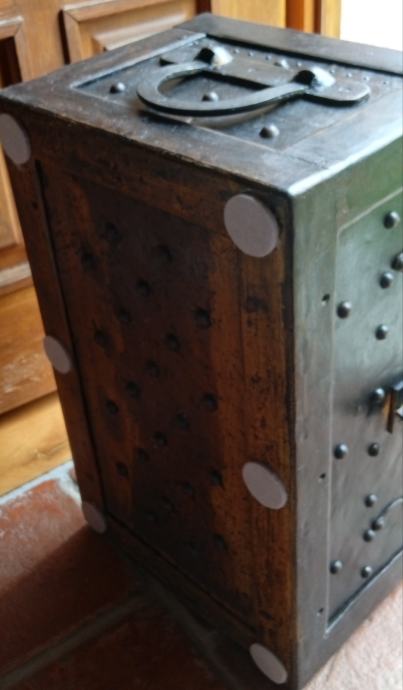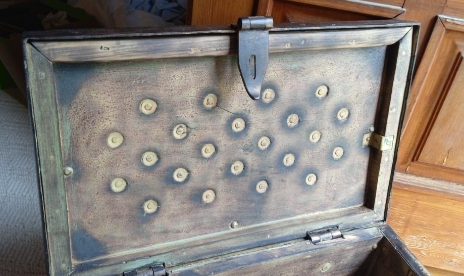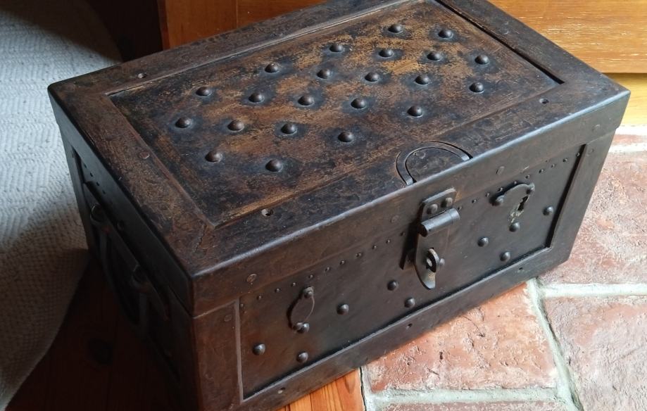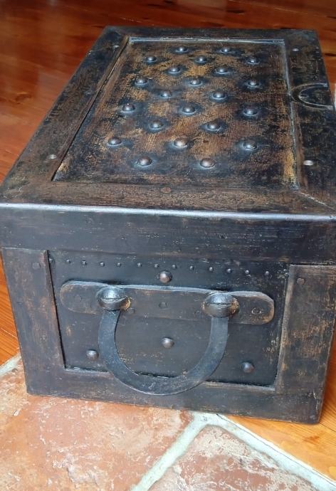 Kovana škrinja za novac,zlato i dragocjenosti iznutra obložena drvetom,trostruko zaključavanje.dužina50cm,širina31cm i visina 25cm,kompletno restaurirana metal nema hrđe drvo zdravo,stanje odlično.