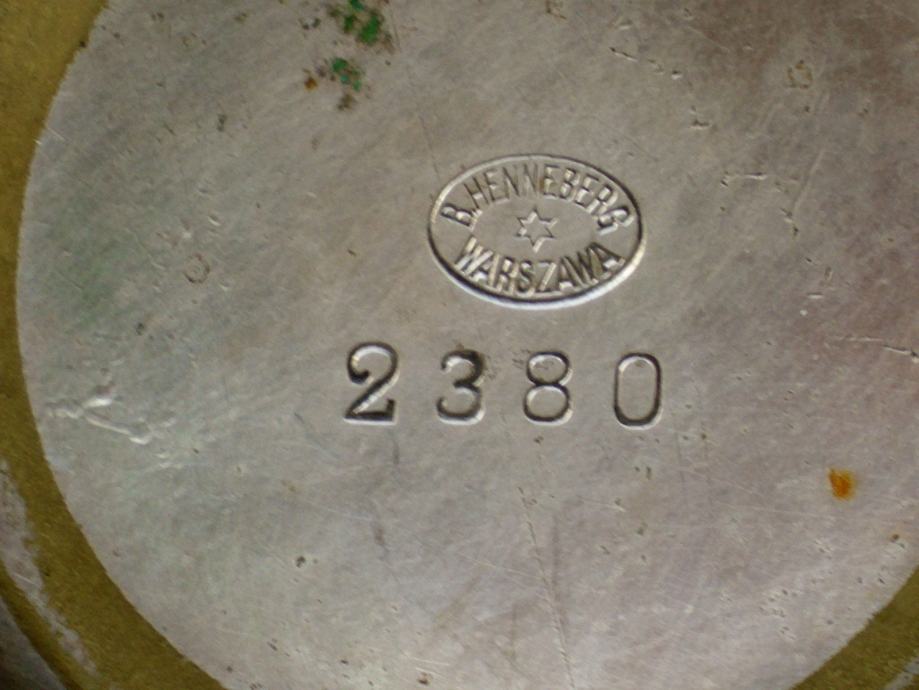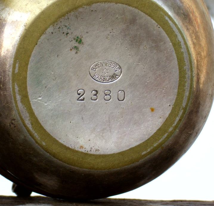 Early mark of Bros. Henneberg firm, which refers to galvanic silver deposition. It consists of the Polish inscription "B.HENNEBERG WARSZAWA", which is a shortening of "BRACIA HENNEBERG WARSZAWA" (in English "BROTHERS HENNEBERG WARSAW"), placed inside an oval with the Star of David in the centre. Below, a catalogue number is given. Rather common.