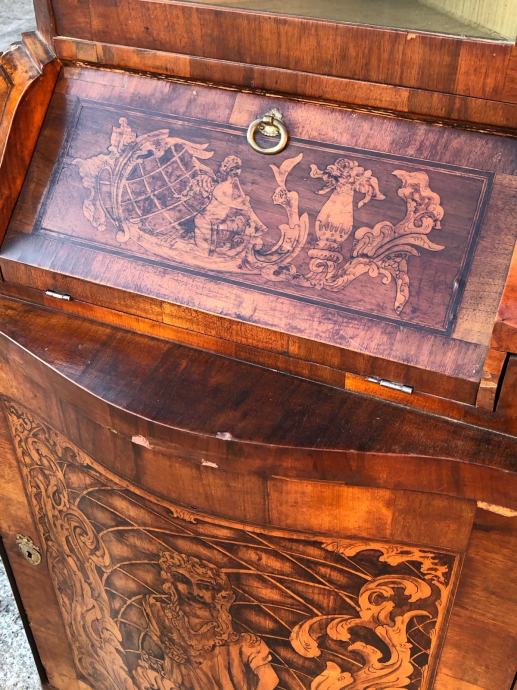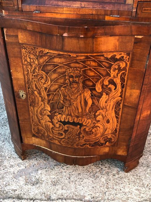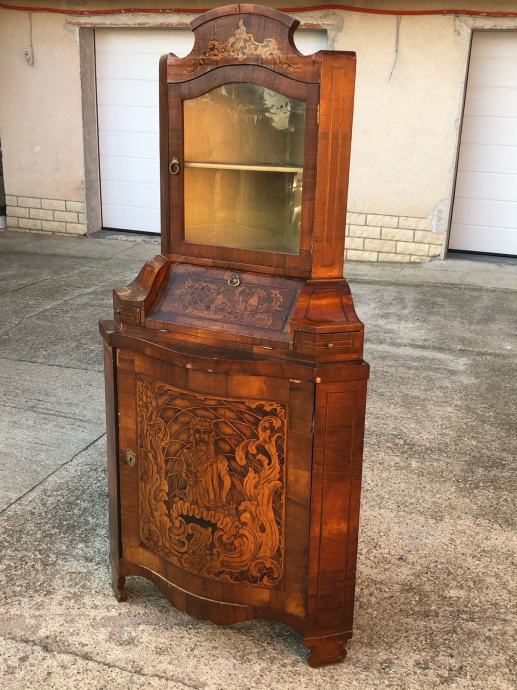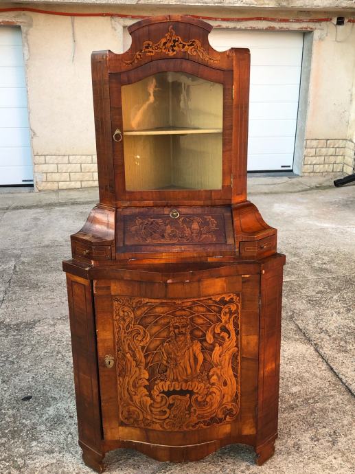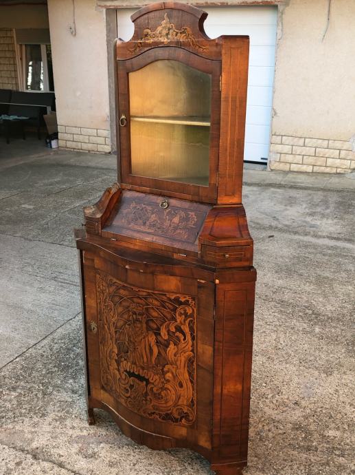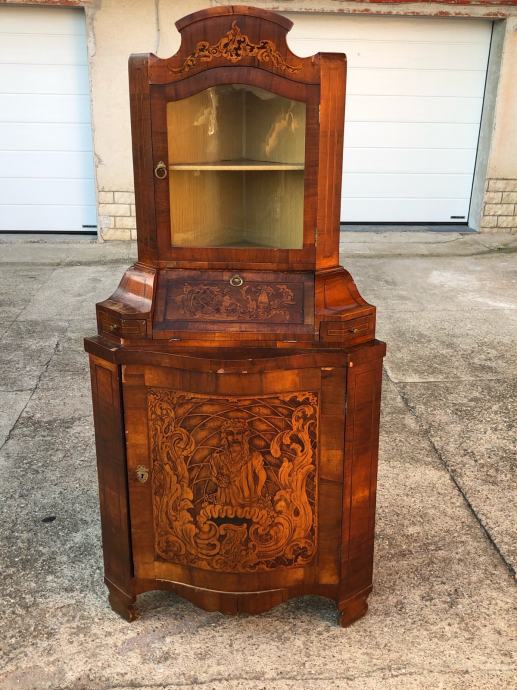 Kutna vitrina radena po stilu baroka, napravljena u 19 stoljecu i u dobrom je stanju. Furnirana je orahovim furnirom i puna je intarzija.