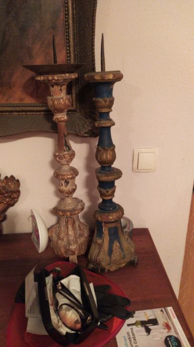 Barokni drveni svjecnjaci, plavi ostecen.Plavi 1000kn a bjeli 1500kn
