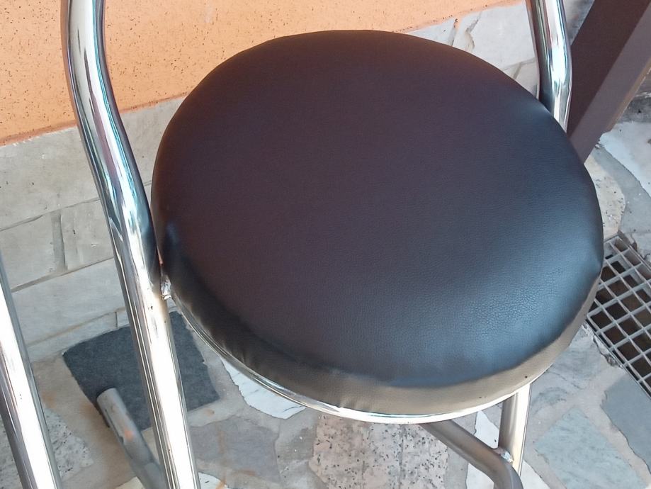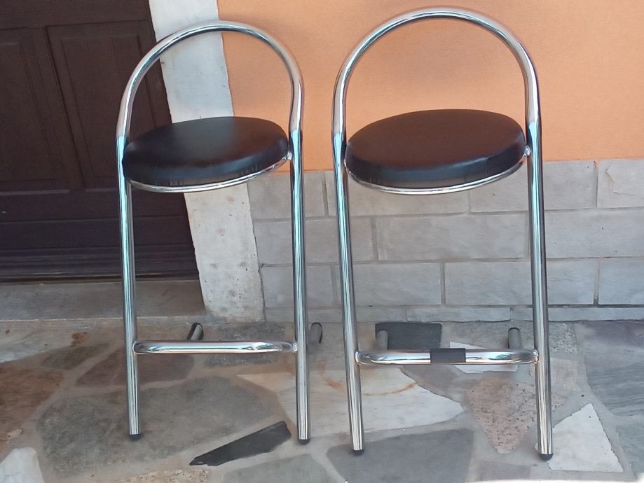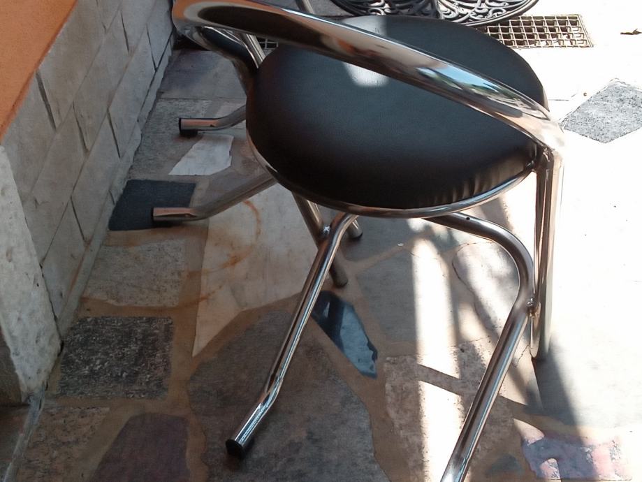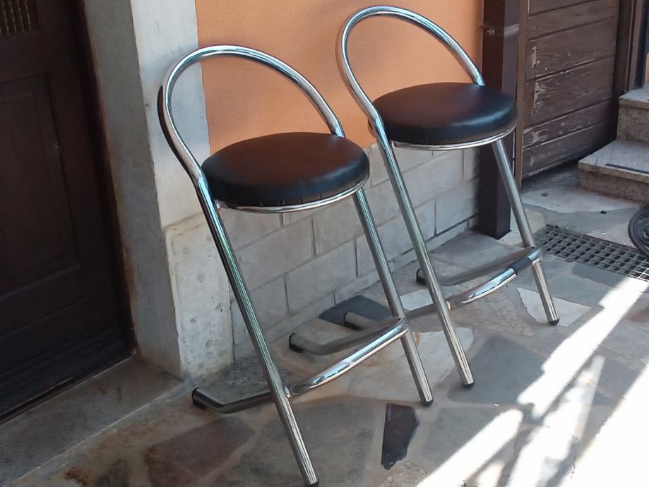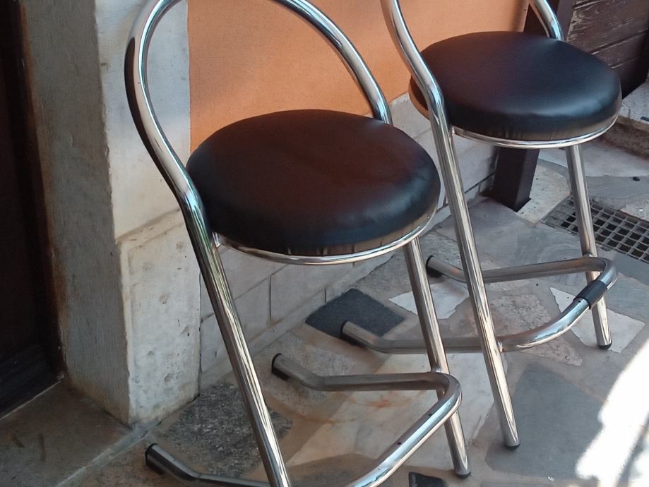 Metalne barske stolice sa koznim sjedistem i naslonom u odličnom stanju, 4 komada. Cijena jedne stolice je 60 eura. Visina stolice je 88 cm, a visina sjedista 67 cm.