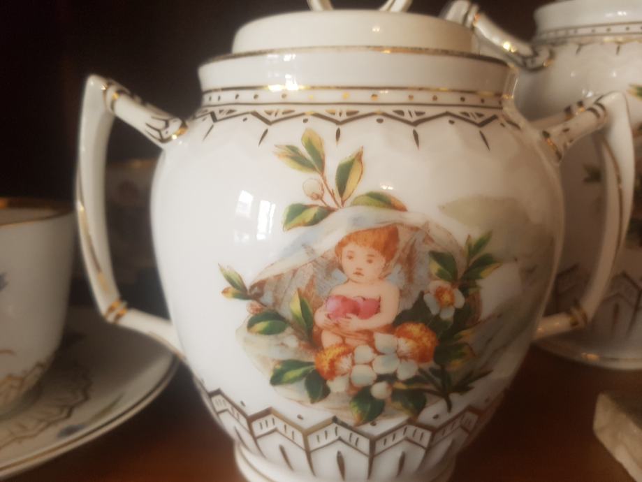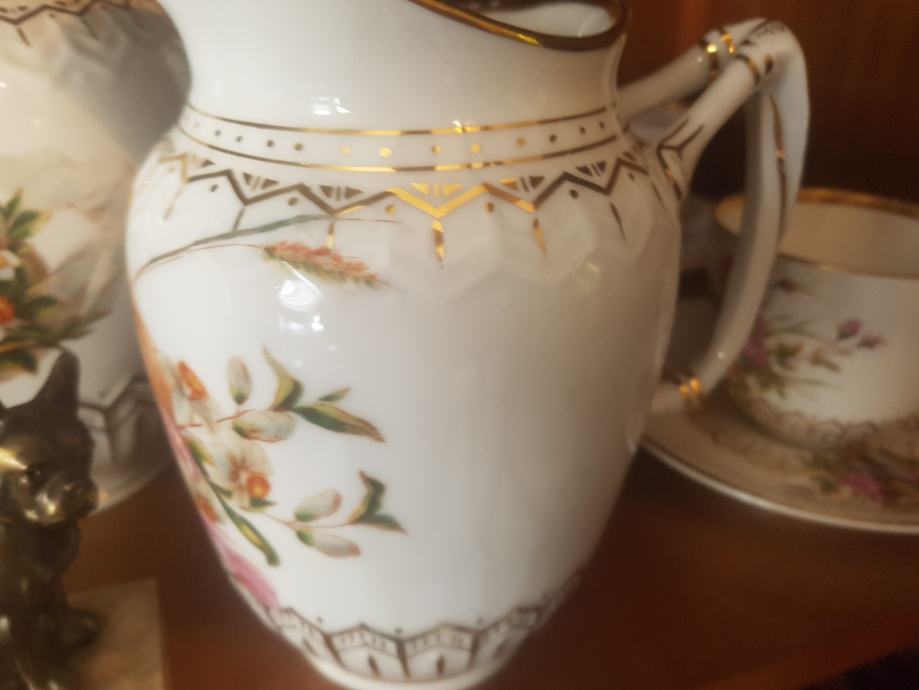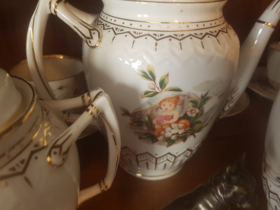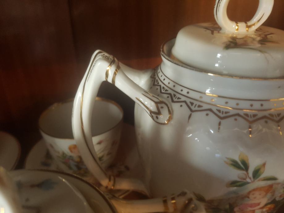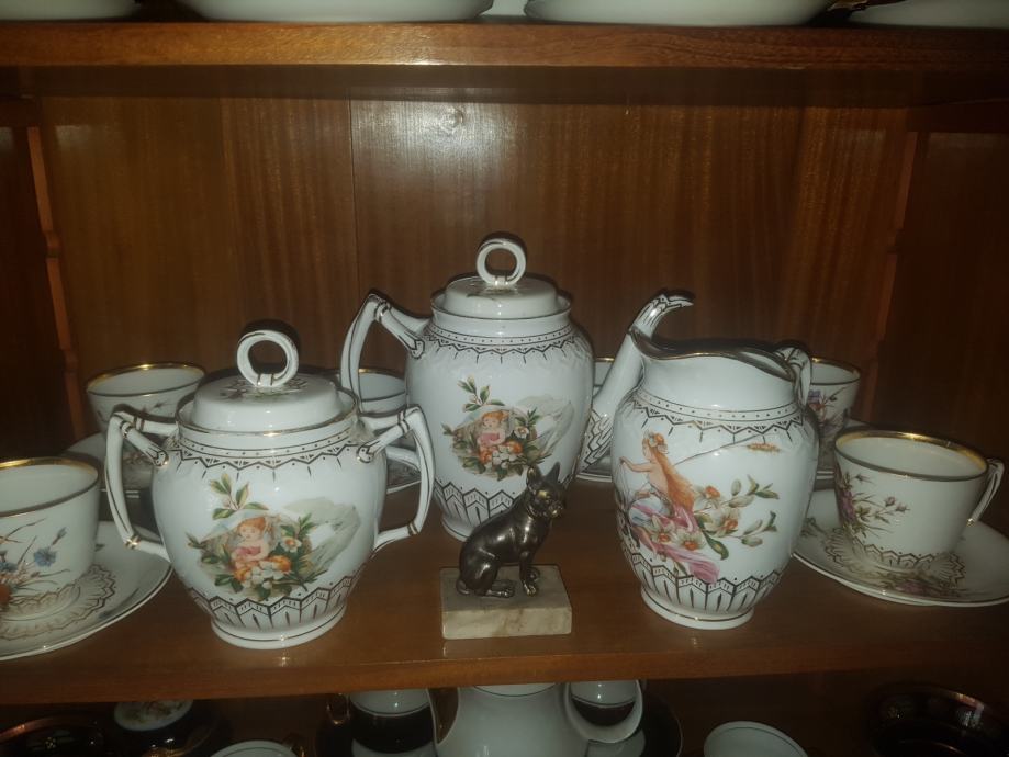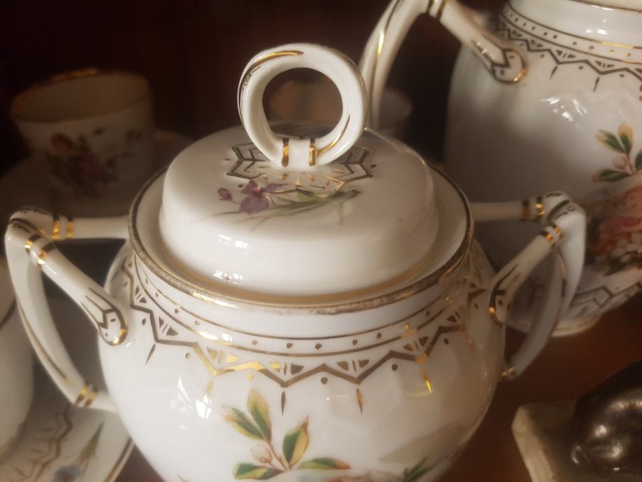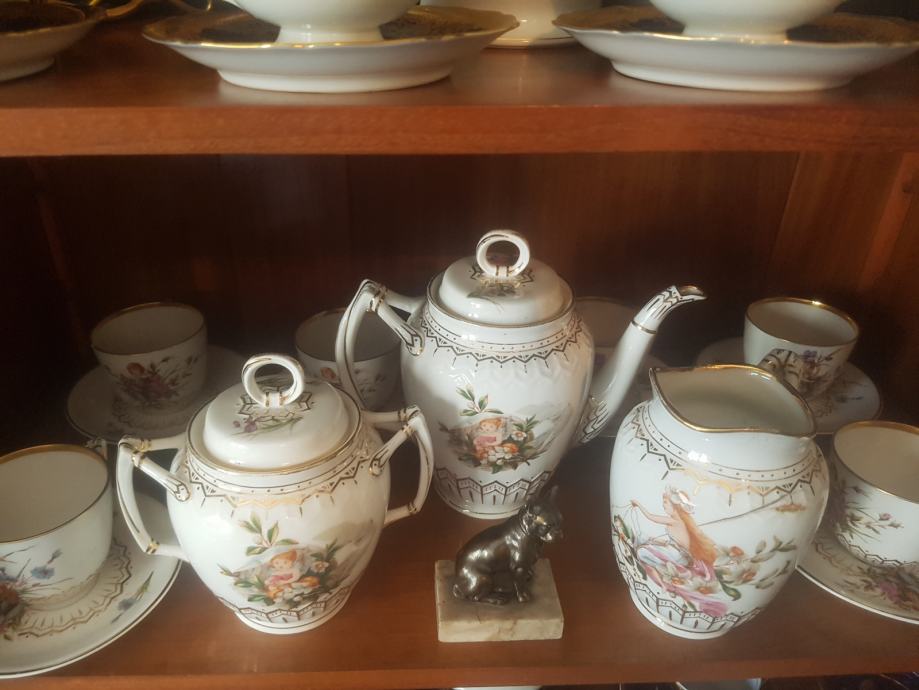 Prekrasan, jedinstven i vrhunski servis kakvih više nema :) Kraj 19 stoljeća, ručno oslikan, fini tanki porculan, kompletan što je rijetkost. Sastoji se od čajnika, vrča za mlijeko, šečernice i 6 šalica s pripadajućim tanjurićima ( svaka malo drugačije oslikana jer se radi o ručnom radu). Dvije šalice i tanjurić su minimalno okrhnuti ali ipak se radi o servisu koji je preživio čitavo 20.st. Ostatak je u besprijekornom stanju. Iz raloga okrhnuća (vidljivo na fotografijama) i je ovakva cijena jer bi inače bila znatno znatno viša.