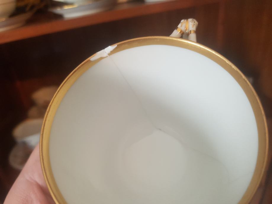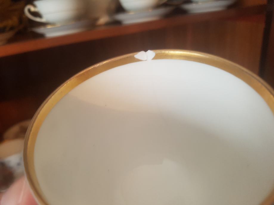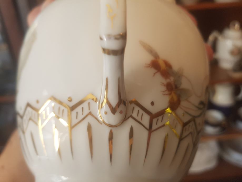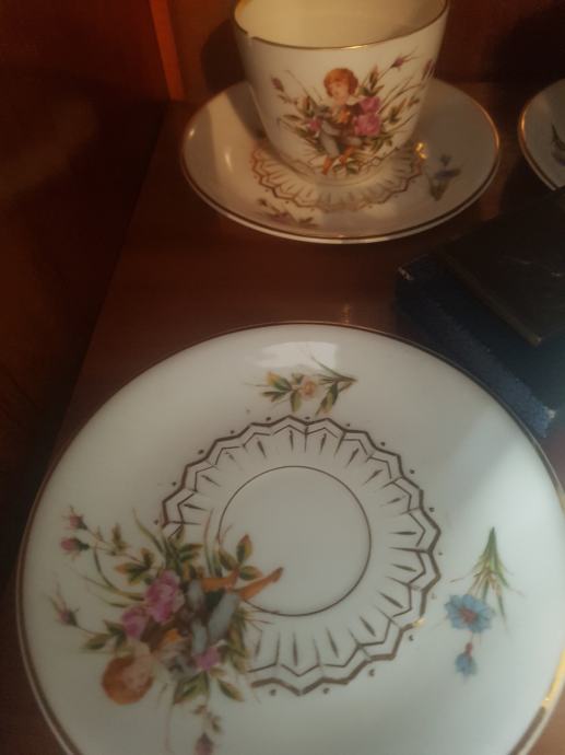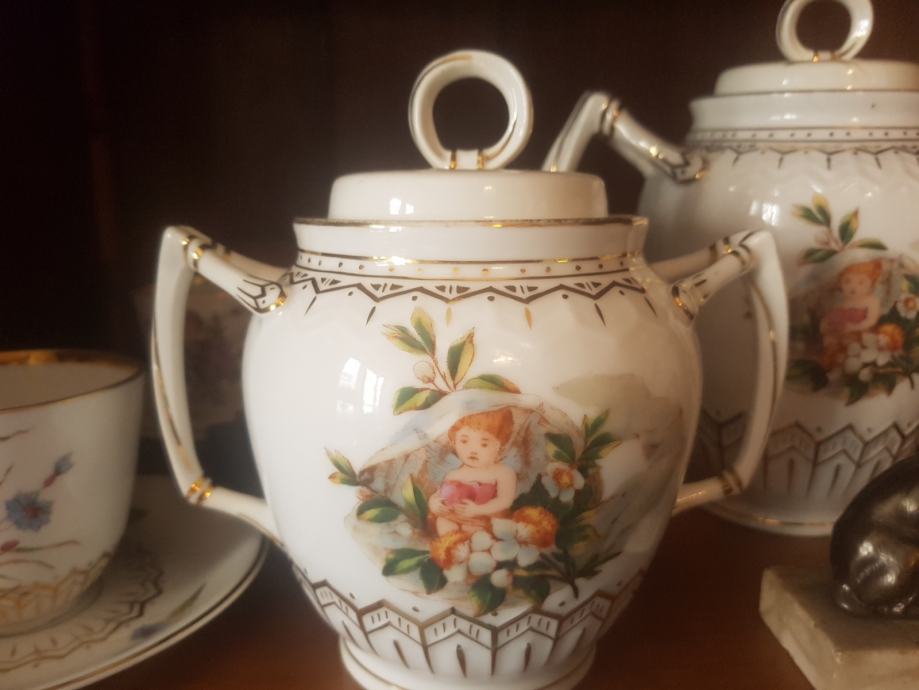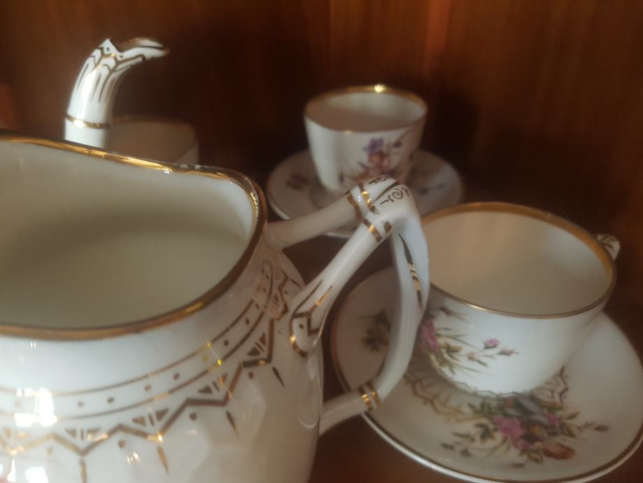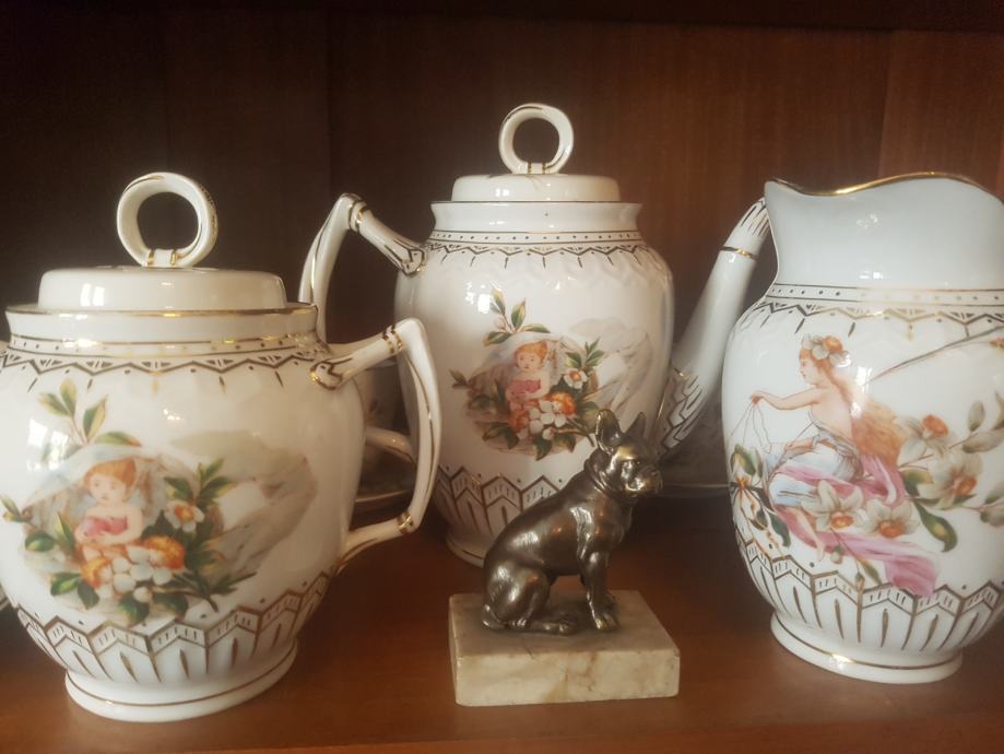 Prekrasan, jedinstven i vrhunski servis kakvih više nema :) Kraj 19 stoljeća, ručno oslikan, fini tanki porculan, kompletan što je rijetkost. Sastoji se od čajnika, vrča za mlijeko, šečernice i 6 šalica s pripadajućim tanjurićima ( svaka malo drugačije oslikana jer se radi o ručnom radu). Dvije šalice i tanjurić su minimalno okrhnuti ali ipak se radi o servisu koji je preživio čitavo 20.st. Ostatak je u besprijekornom stanju. Iz raloga okrhnuća (vidljivo na fotografijama) i je ovakva cijena jer bi inače bila znatno znatno viša.