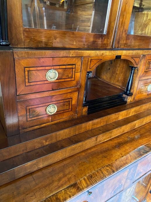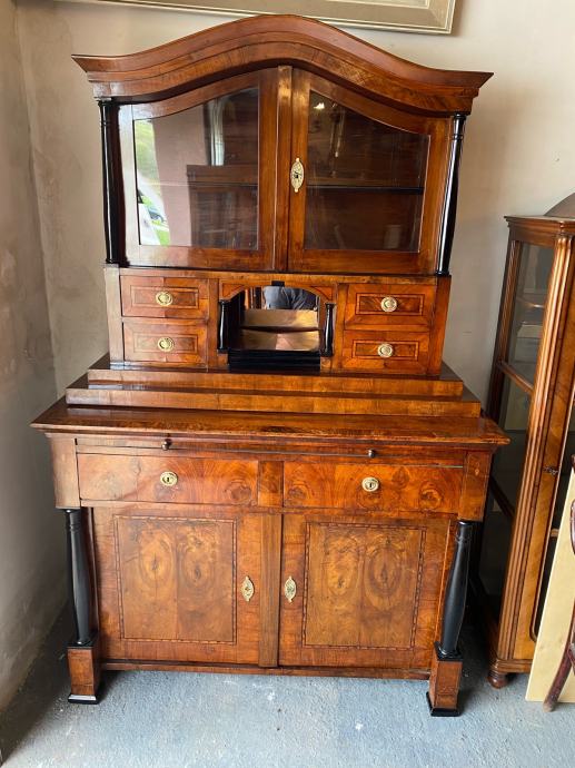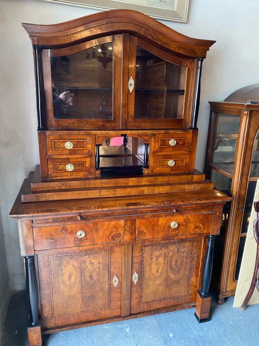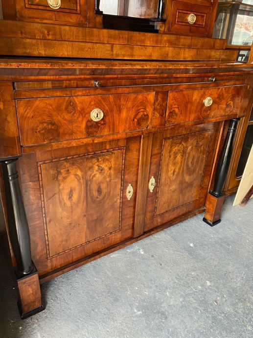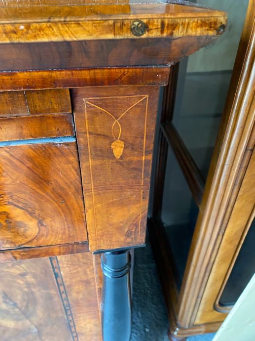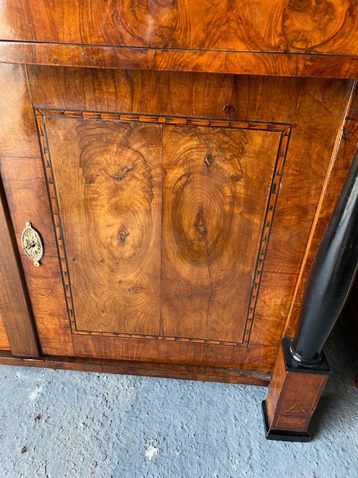 Bidermajer kredenac u vrlo dobrom stanju, furniran krasnim orahovim furnirom sa puno intarzija.